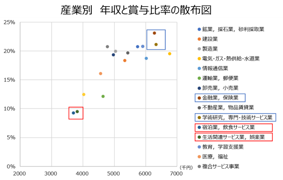 一方、16種類の産業のうち、賞与比率が最も低い産業は「宿泊業,飲食サービス業」(9.3%)、2番目に低い産業は「生活関連サービス業,娯楽業」(9.5%)であることが明らかになりました。