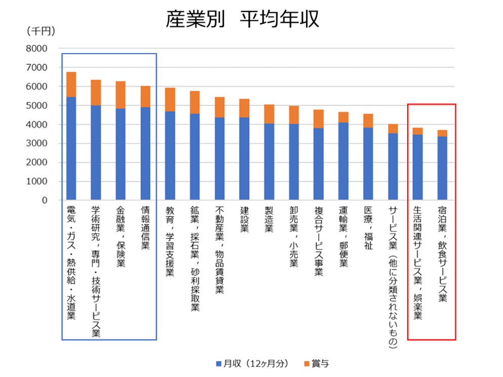 平均年収が400万円を下回る産業は、「宿泊業,飲食サービス業」で370万円、「生活関連サービス業,娯楽業」で381万円だと判明しました。
