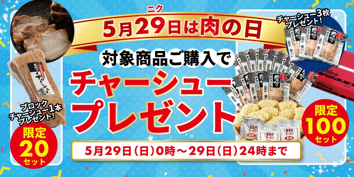 5月29日は“肉の日”としまして、対象商品をご購入のお客様に自家製チャーシューをプレゼントいたします!