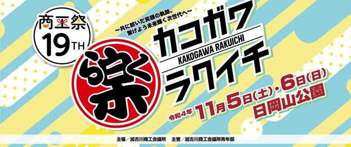 兵庫県加古川市(市長 岡田 康裕)の加古川商工会義所は、令和4年11月5日(土)、6日(日)の2日間、商工祭 第19回加古川楽市を昨年に引き続き、日岡山公園にて開催いたします。本年度は「共に紡いだ笑顔の軌跡。繋げよう未来輝く次世代へ!」というテーマを掲げ、より一層加古川を盛り上げ、地域の方々に笑顔になっていただけるイベントになるよう尽力してまいります。