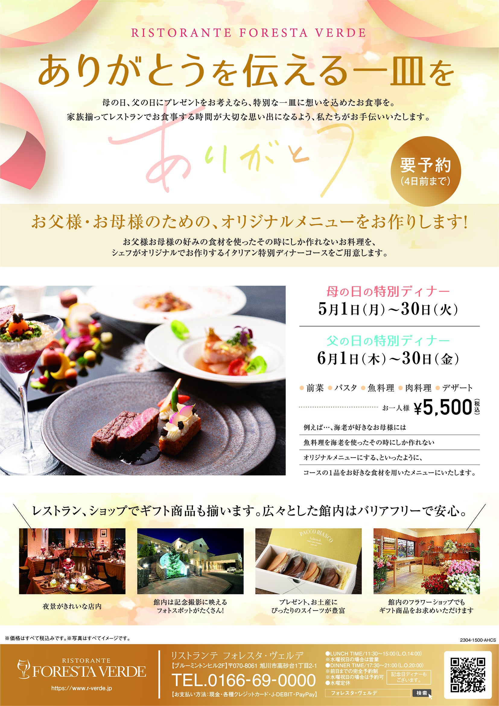 株式会社あいプラン(北海道札幌市/代表取締役・新道喜信)のリストランテ フォレスタ・ヴェルデ(北海道旭川市高砂台1丁目2-1)では母の日・父の日イベントとして、5/1~6/30の期間で特別なディナーをご提供いたします。シェフオリジナルの特別ディナーは、お母さん、お父さんのお好きな食材を使って作るスペシャルコース。ご家族で、おふたりで、日頃の感謝が伝わる特別なお食事に是非ご利用ください。