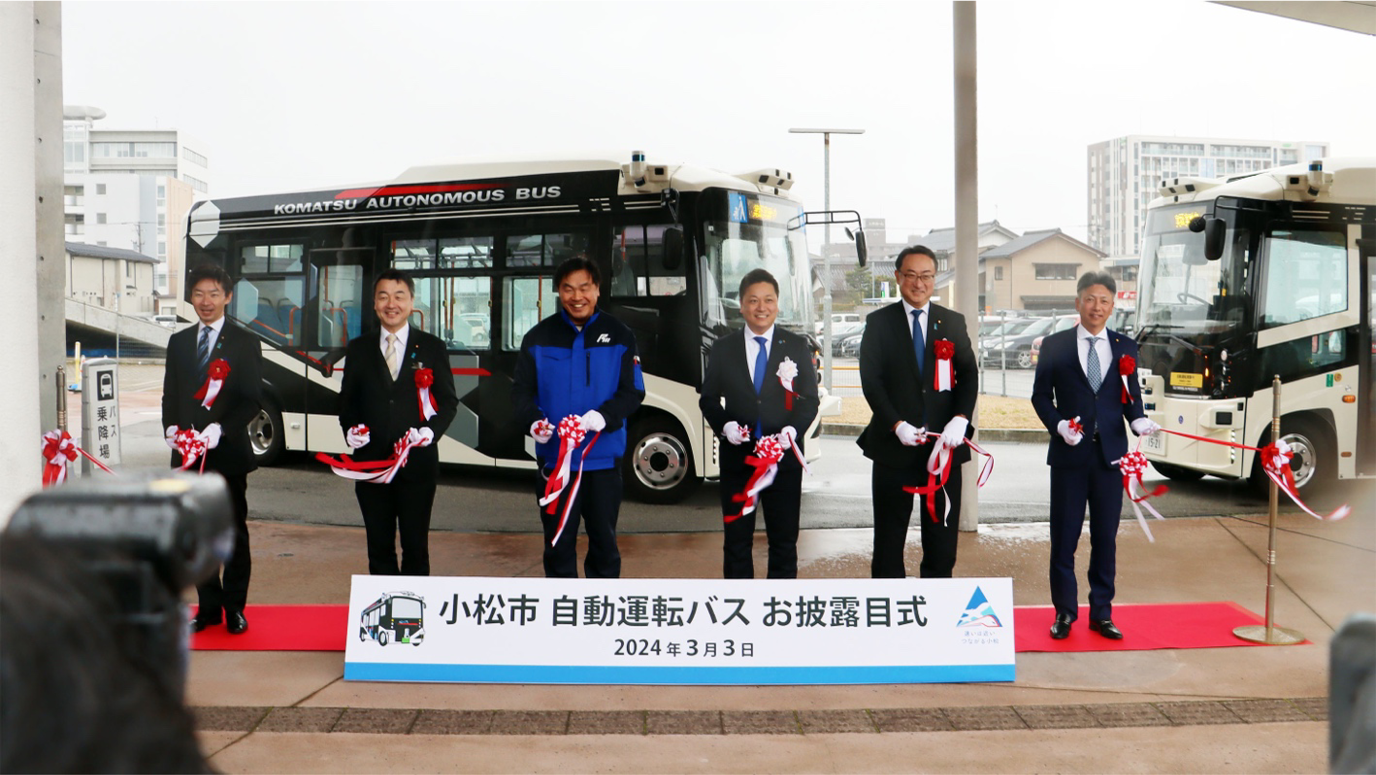 石川県小松市(市長:宮橋 勝栄)、BOLDLY株式会社(ボードリー、本社:東京都港区、代表取締役社長 兼 CEO:佐治 友基、以下「BOLDLY」)、株式会社ティアフォー(本社:愛知県名古屋市、代表取締役社長:加藤 真平、以下「ティアフォー」)、アイサンテクノロジー株式会社(本社:愛知県名古屋市、代表取締役社長:加藤 淳、以下「アイサンテクノロジー」)および損害保険ジャパン株式会社(本社:東京都新宿区、代表取締役社長:石川 耕治、以下「損保ジャパン」)の5者は、2023年10月23日から2024年3月3日まで、北陸新幹線小松駅の開業に向け、JR小松駅と小松空港をつなぐルートでの自動運転EVバス(「自動運転バス」)の長期試験走行を実施しました。最終日となる3月3日には、石川県知事や国会議員をはじめとするご来賓を招いて自動運転バスお披露目式を開催し、セレモニーや自動運転をテーマとしたシンポジウムに加え、地域住民を対象とする試乗会を開催しました。