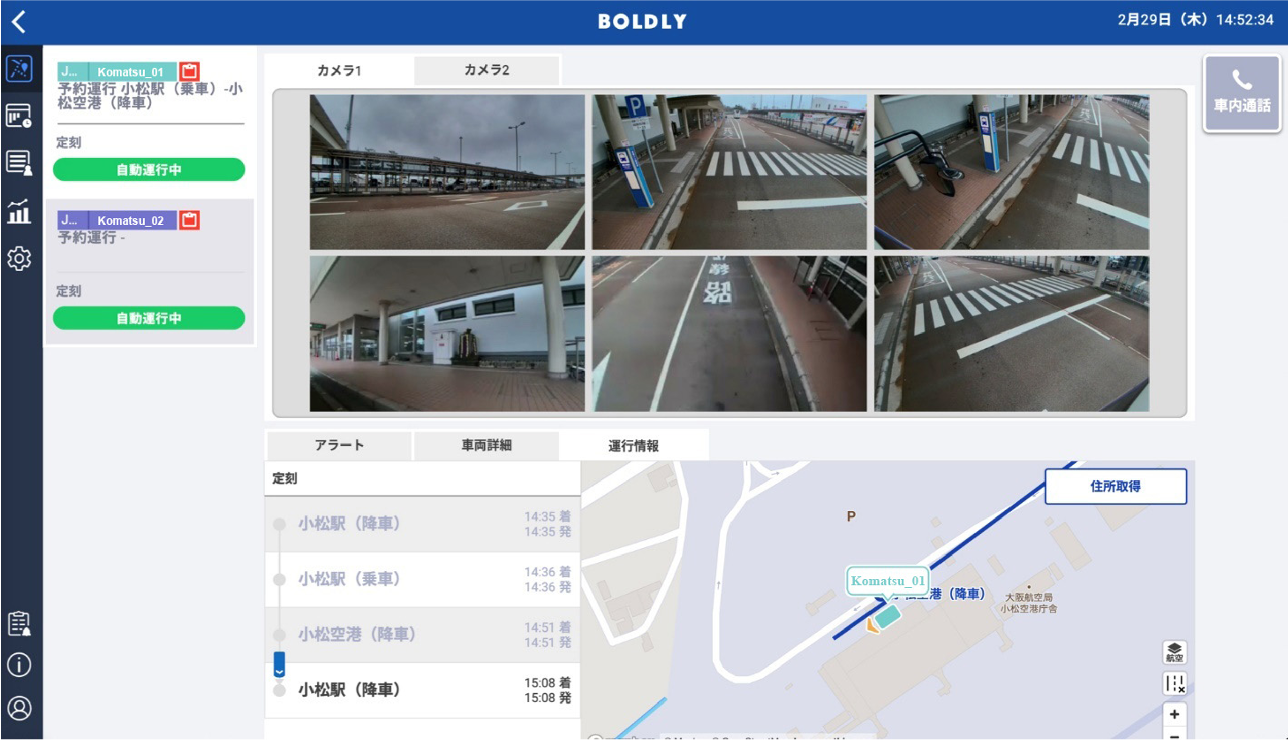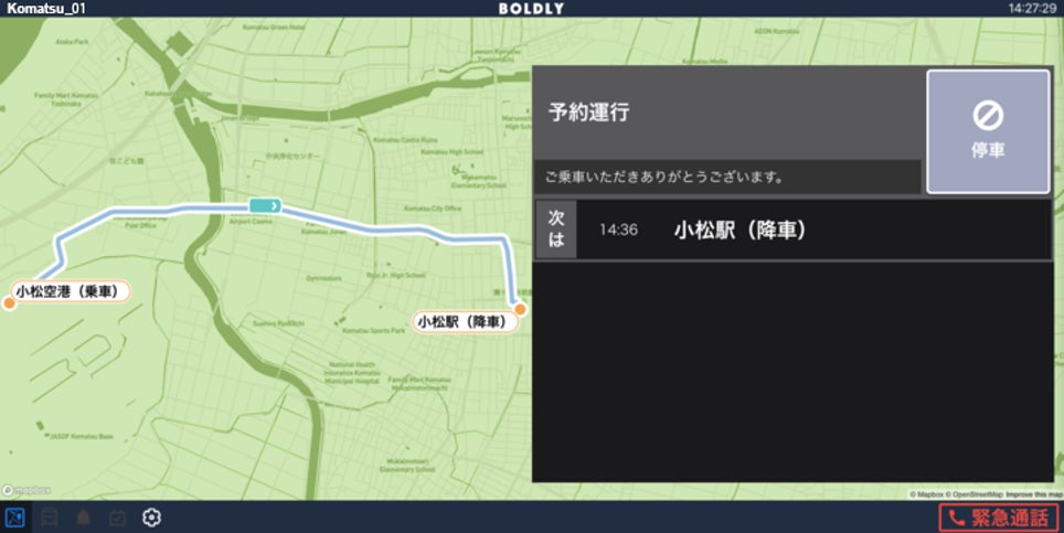 小松市、BOLDLY、ティアフォー、アイサンテクノロジーおよび損保ジャパンの5者は、北陸新幹線小松駅の開業に合わせてJR小松駅・小松空港間のさらなるアクセス向上を図るため、2022年8月3日に、自動運転バスの通年運行の社会実装を軸とした連携協定を締結しました※1。自動運転バスの社会実装を見据えて実施した今回の長期試験走行では、JR小松駅・小松空港間のルートにおいて、損保ジャパンによる自動運転リスクアセスメント※2やアイサンテクノロジーによる高精度3次元地図データの作成を事前に行った上で、自動運転バス「Minibus」(ティアフォー製)を用いて、ティアフォーが開発を主導する自動運転ソフトウエア「Autoware(オートウエア)※3」による自動走行や、BOLDLYが提供する自動運転車両運行管理プラットフォーム「Dispatcher(ディスパッチャー)」を使った遠隔監視を実施しました。自動走行のさらなる安定性向上を目的に、このたび導入する信号情報提供システム※4や、路車協調システム※5の実証実験も行いました。自動運転レベル2で1日に4~5往復走行し、BOLDLYとティアフォーの社員が車内のオペレーターおよび遠隔監視者を務めるとともに、社会実装時に運行を担う地域の交通事業者に対してBOLDLYによるトレーニングも実施しました。