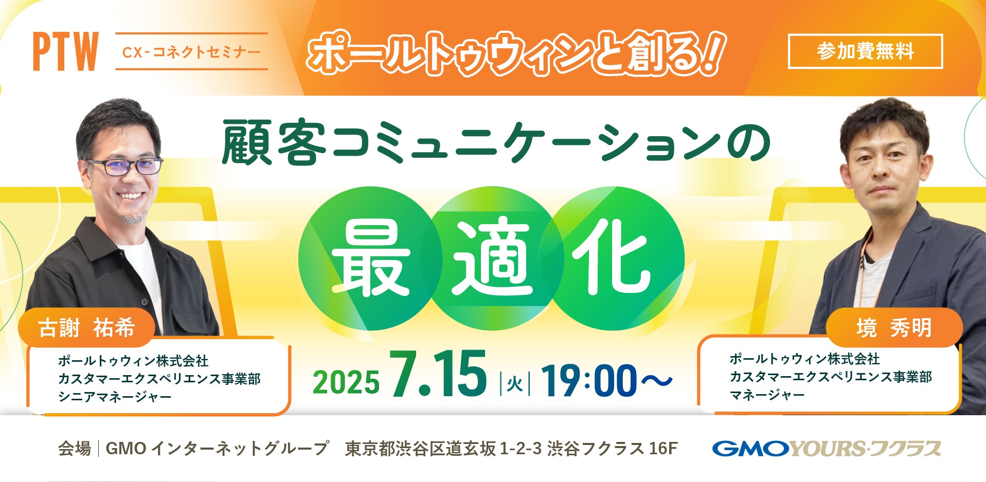 サービス・ライフサイクルにおける課題解決を支援するポールトゥウィン株式会社(本社:愛知県名古屋市、代表取締役CEO:橘 鉄平、代表取締役COO:志村 和昭、以下「ポールトゥウィン」)では、2025年7月15日(火)に無料セミナー「<CX-コネクト>ポールトゥウィンと創る!顧客コミュニケーションの最適化」を開催いたします。