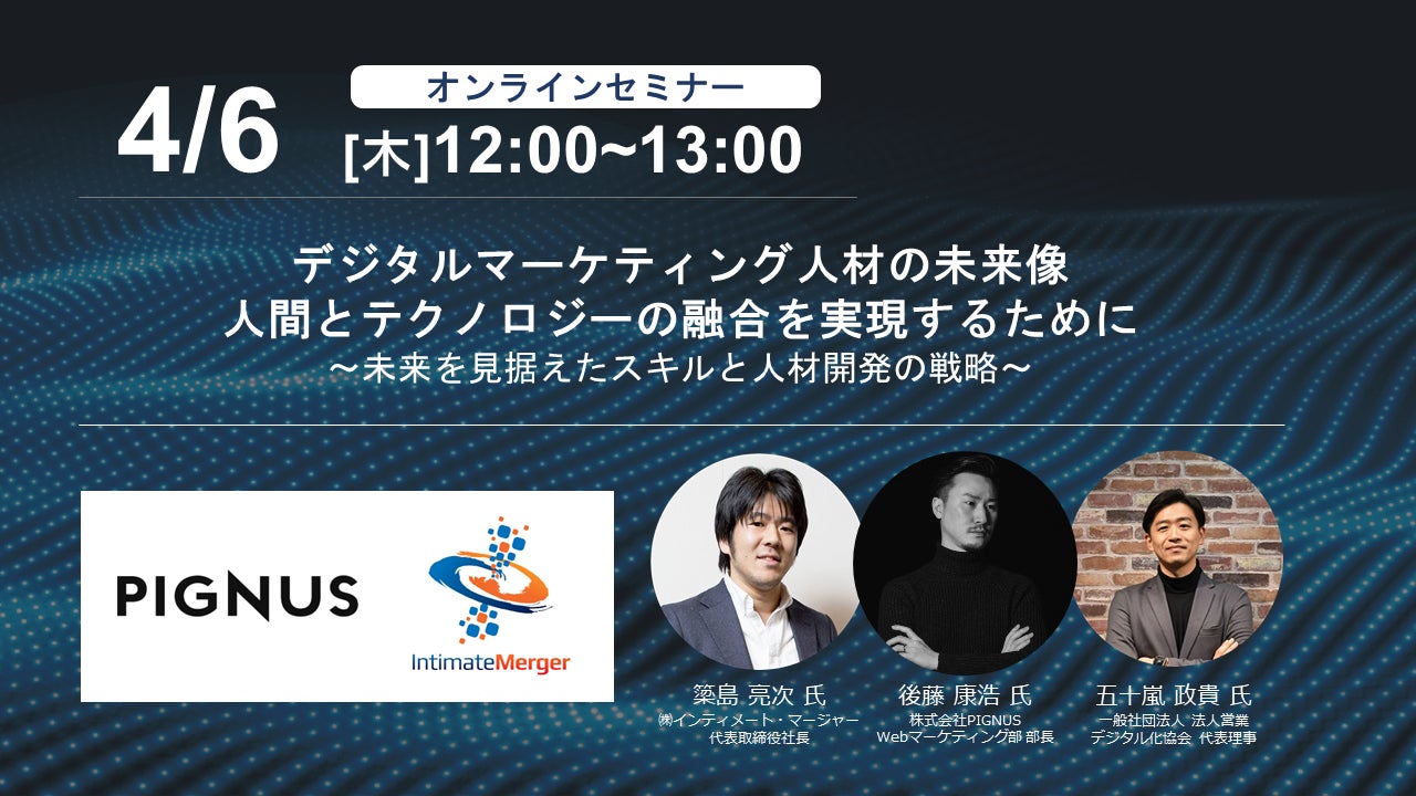 インティメート・マージャー、4/6(木)にPIGNUSとセミナー共催「デジタルマーケティング人材の未来像: 人間とテクノロジーの融合を実現するために~未来を見据えたスキルと人材開発の戦略~」