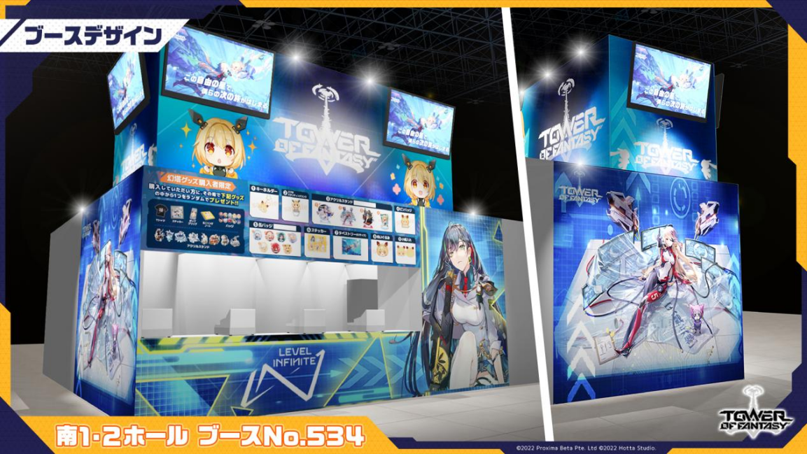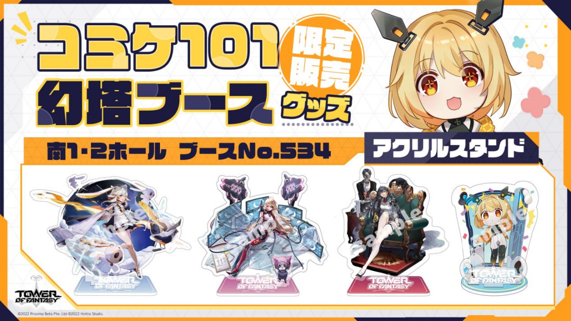 出展ブースでは、人気キャラクターのアクリルスタンドを含む全11種類の幻塔限定グッズを先行販売するほか、期間限定の購入者限定キャンペーンも第1弾・第2弾に分けて行います。また、出展ブースのイメージ図を併せて公開します。凛夜(リンヤ)とネメシス、Mi-aが大きくデザインされたブースとなっていますので、当日は彼らを目印に『幻塔』ブースへお越しください。