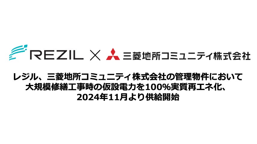 「脱炭素を、難問にしない」をミッションとして掲げるレジル株式会社(本社:東京都千代田区、代表取締役社長 丹治保積、以下 当社)は、三菱地所グループのマンション管理を手掛ける三菱地所コミュニティ株式会社(本社:東京都千代田区、代表取締役 社長:大井田篤彦、以下 三菱地所コミュニティ)が管理・工事監理を行うマンション・ビルの大規模修繕工事時の仮設電力として、再生可能エネルギー電力(実質を含む、以下 再エネ)の供給を2024年11月より全国で開始し、マンション・ビルにおける脱炭素化を支援します。