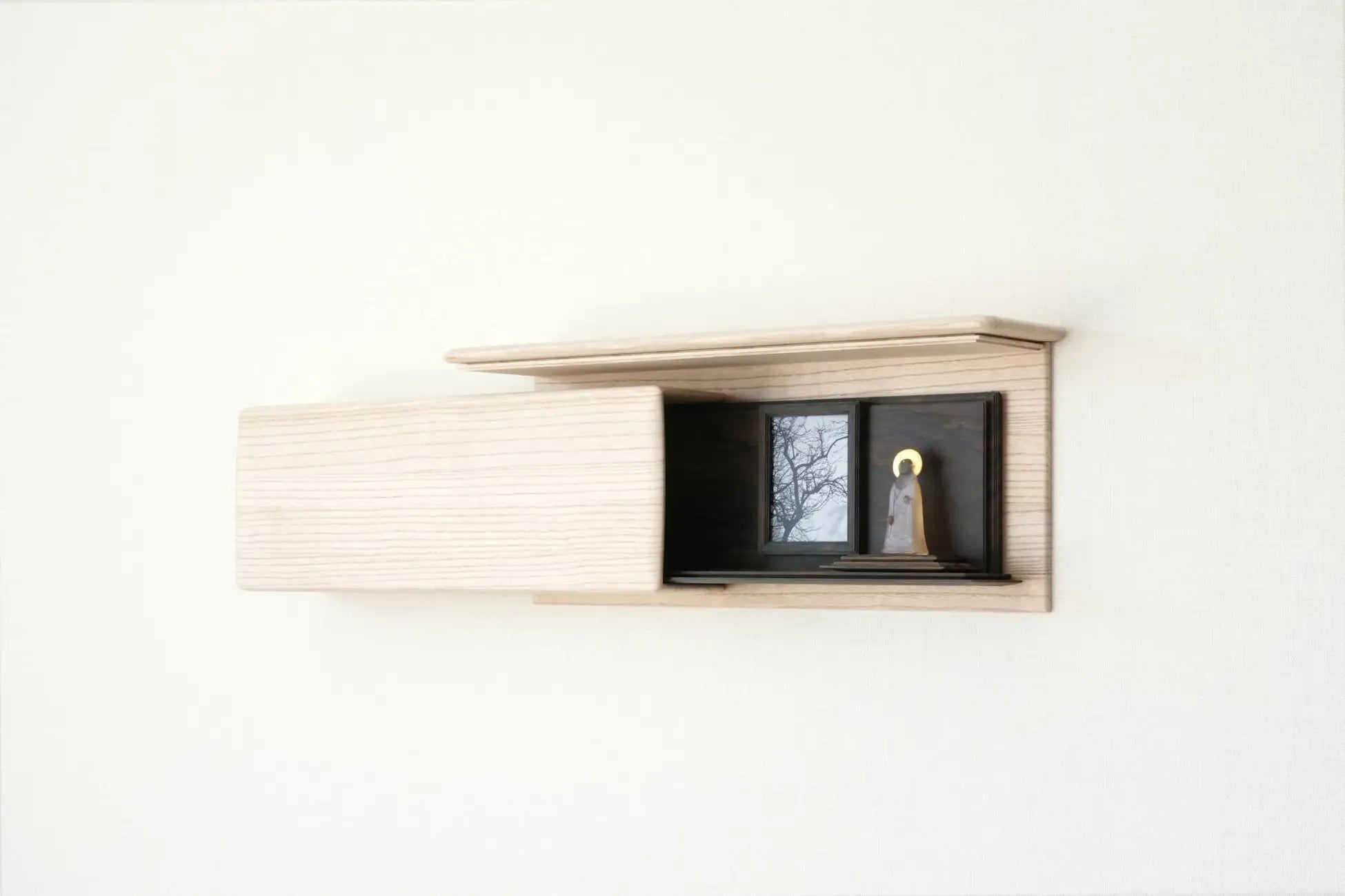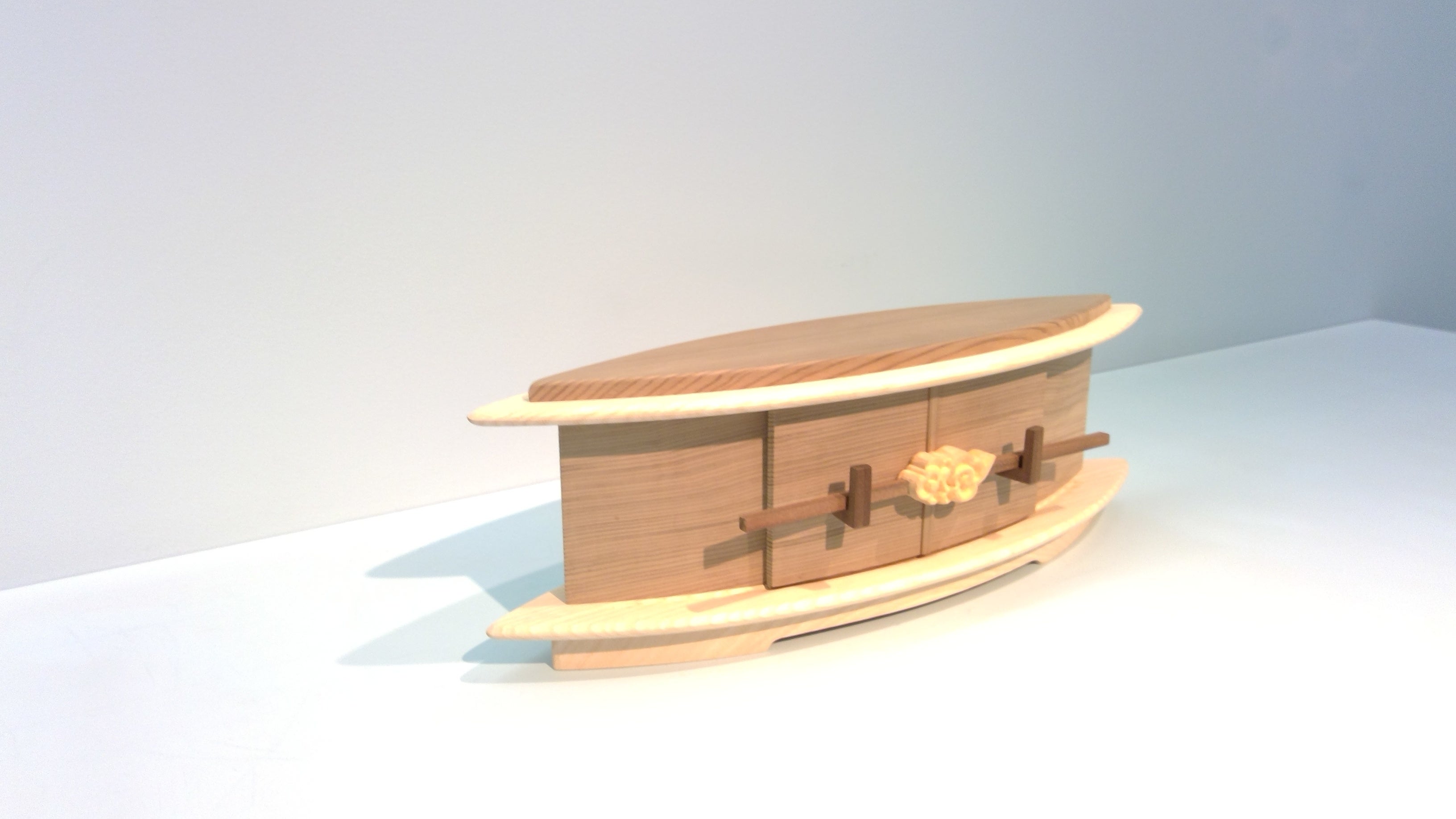 外箱と内箱の間の空間は後板が無く背景が透けて見える「借景」のような厨子。無塗装で仕上げたことで、木の風合いが生きる。
