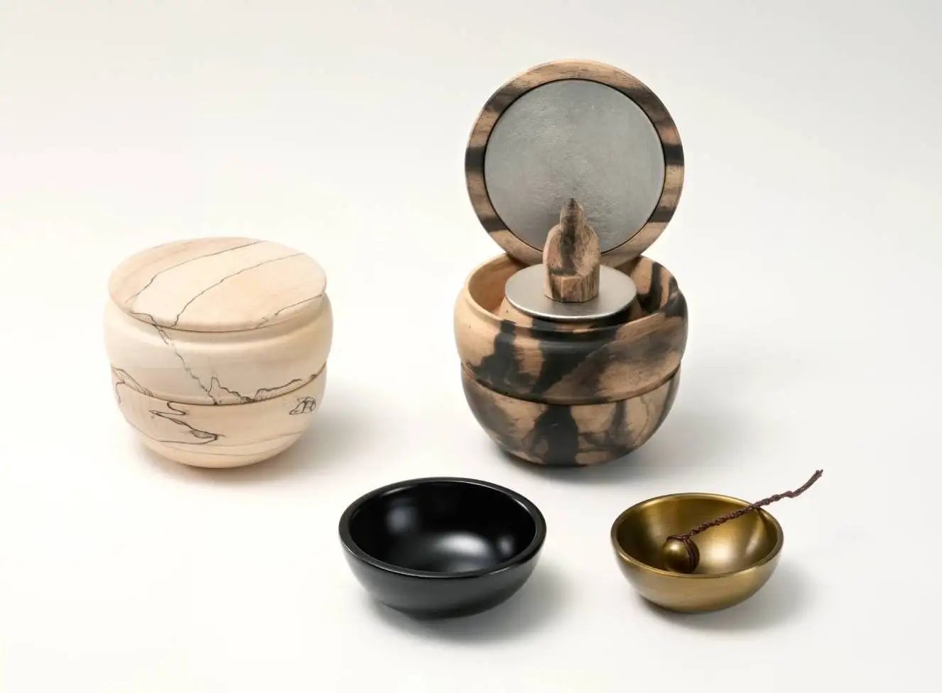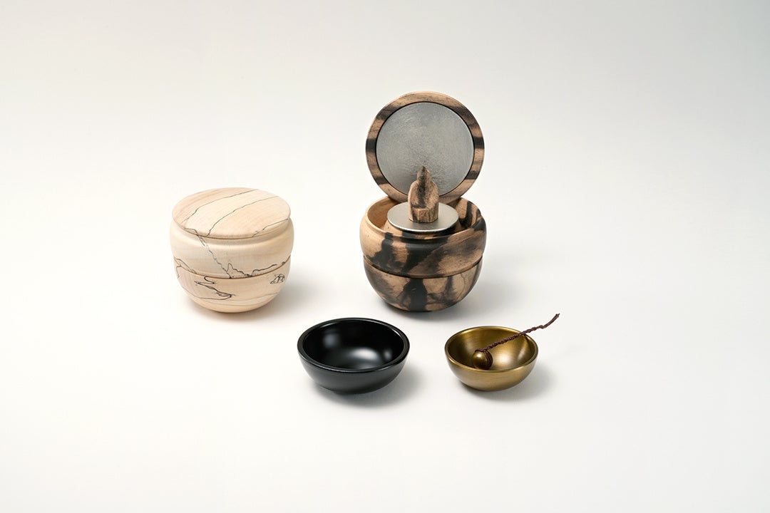 小さな器の中に本尊・水入れ・リンをコンパクトに収納できる、棗型の携帯厨子。本尊には少量のお骨を納められる。専用の巾着袋付き。