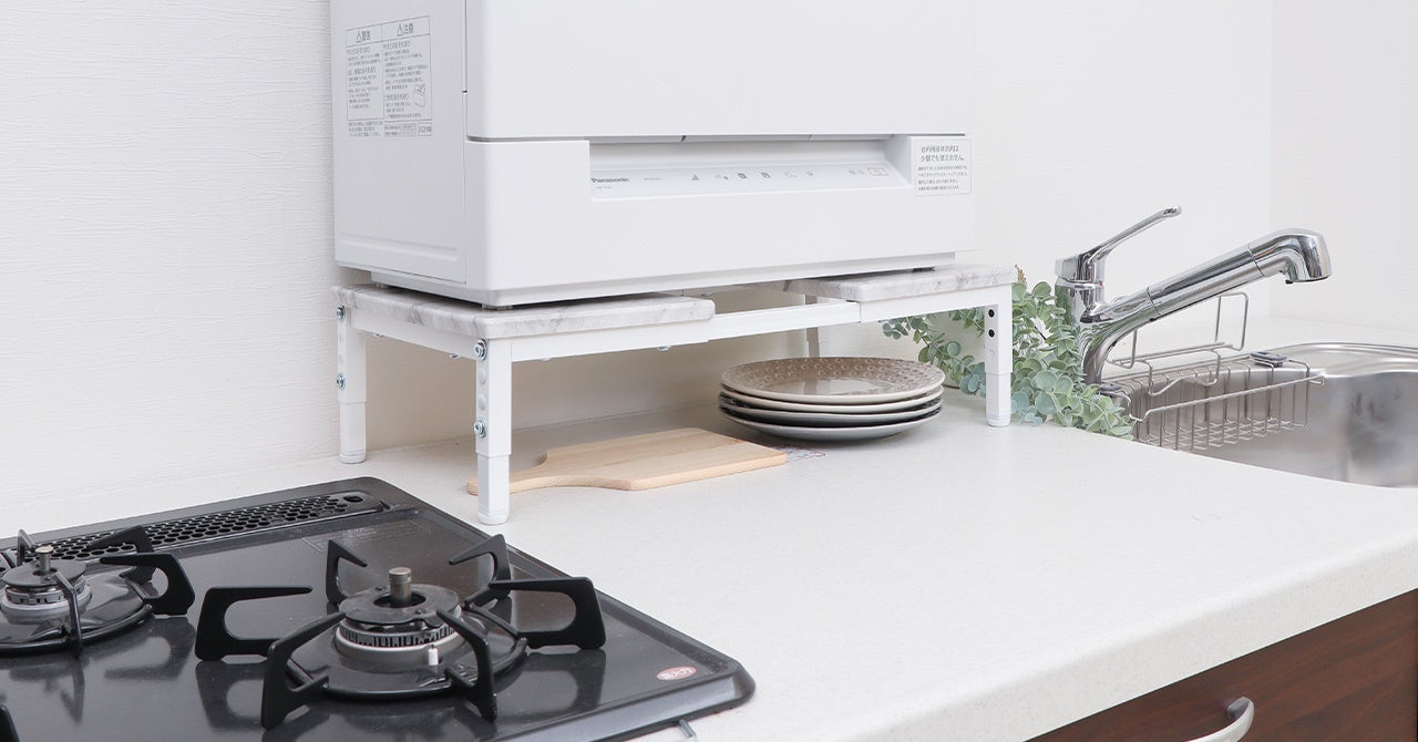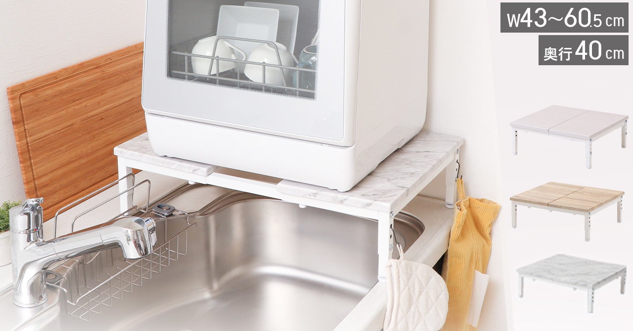 食洗機ラックEcho(エコー)は、天板が伸縮するので、ご家庭のキッチンに合った幅に調節することができます。天板を広げると(約)幅55×奥行29cmの食洗器が設置可能。