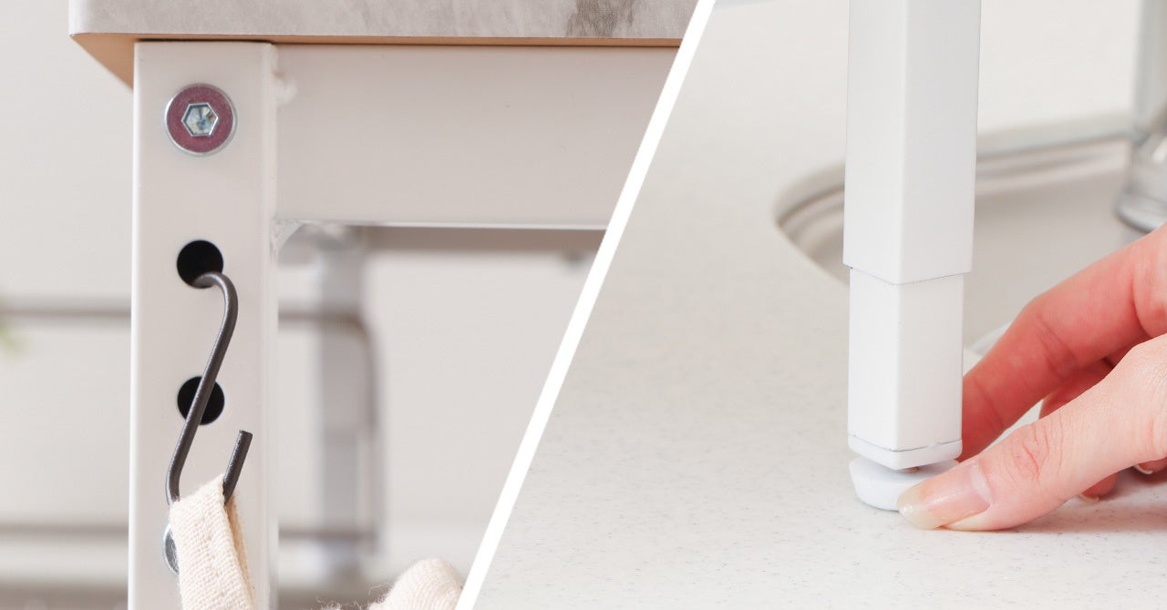 高さ調節用のボルト穴に、S字フックを引っ掛けることもできます。また、脚にはアジャスターを付け、ガタつきが気になる場合などに調節が可能となっています。