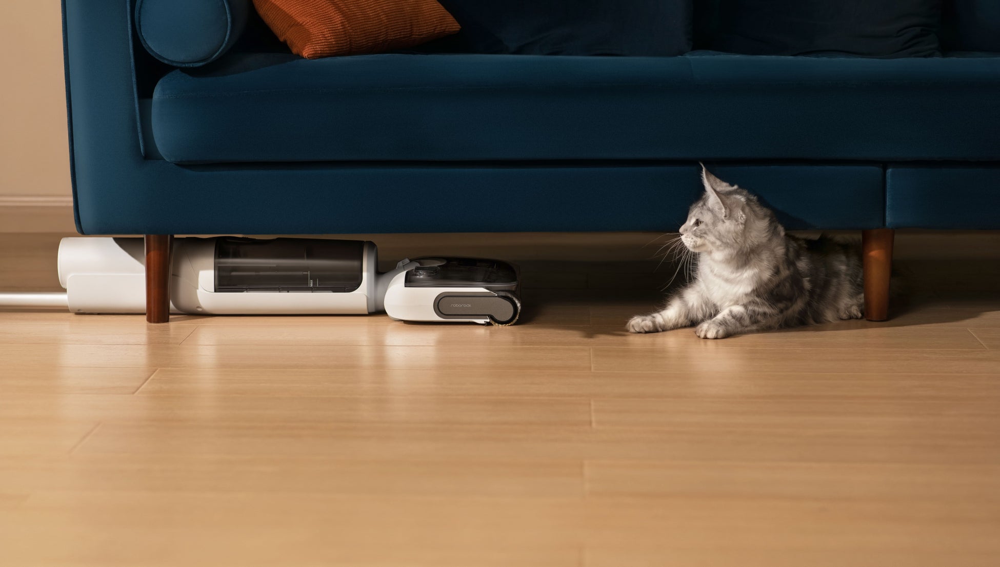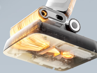 「F25 RT」は、部屋の隅々までヘッドが届くよう設計されており、本体を平行に倒した際の厚さはわずか12.5cmで、高い吸引力を維持しつつ、家具の下など届きにくいスペースを簡単に掃除することができます。また、タンクが低い位置にあることでヘッドを70度回転※3でき、家具や障害物が多くてもスムーズに掃除できます。