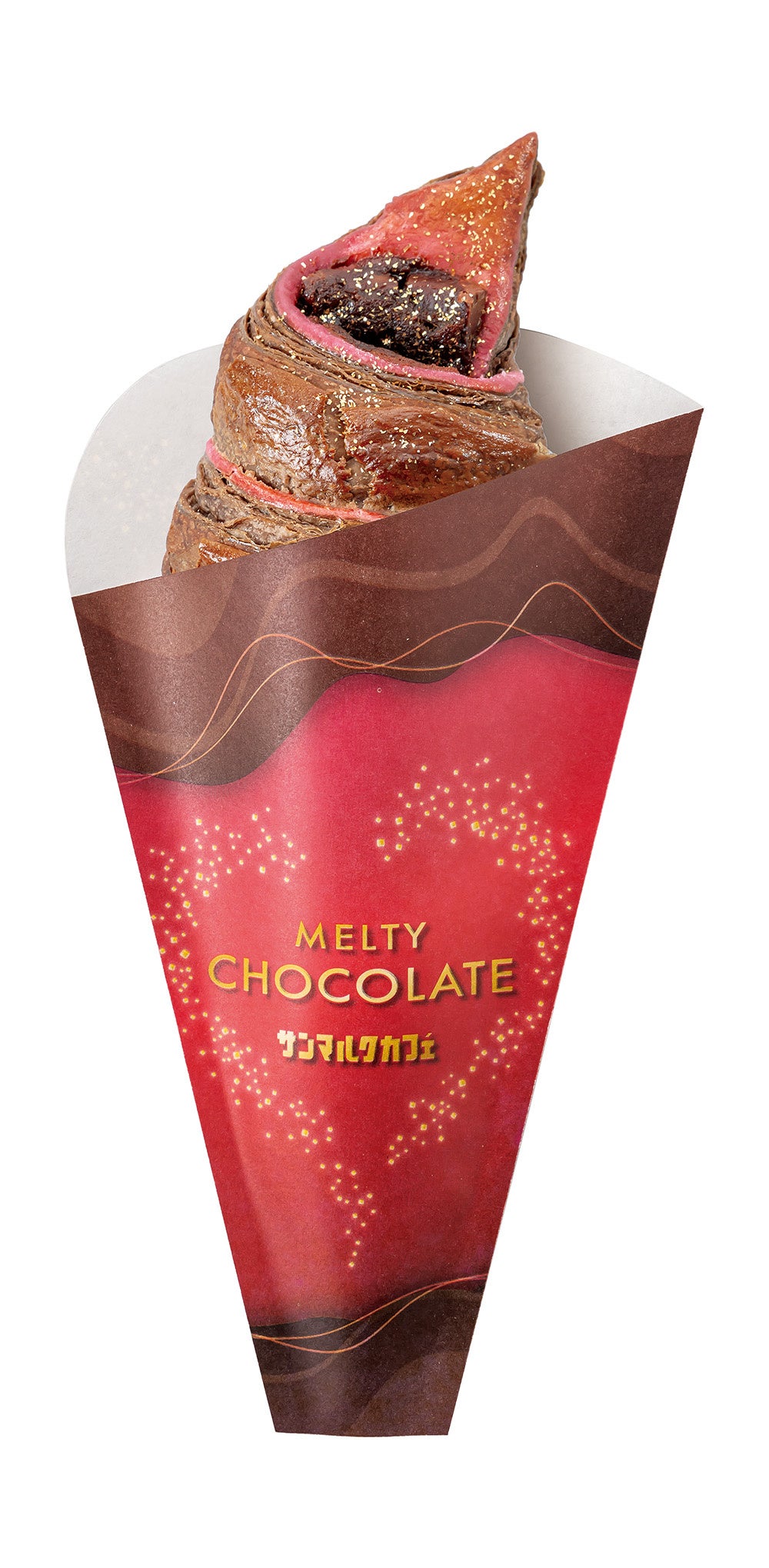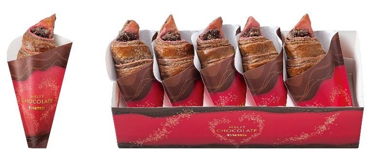『プレミアムチョコクロ メルティ生ショコラ ブラックピンクShinyGOLD』は、チョコレートが練り込まれたサクサクのクロワッサン生地※と口に入れた瞬間にとろ~りとろける生チョコレートクリームの両方からチョコレートの芳醇な香りと味わいを存分にお楽しみいただけます。ブラックとピンクのバイカラークロワッサン生地や仕上げに振りかけられる金粉は、バレンタインの華やかさを表現しており、見た目からもバレンタイン気分を盛り上げるような一品です。