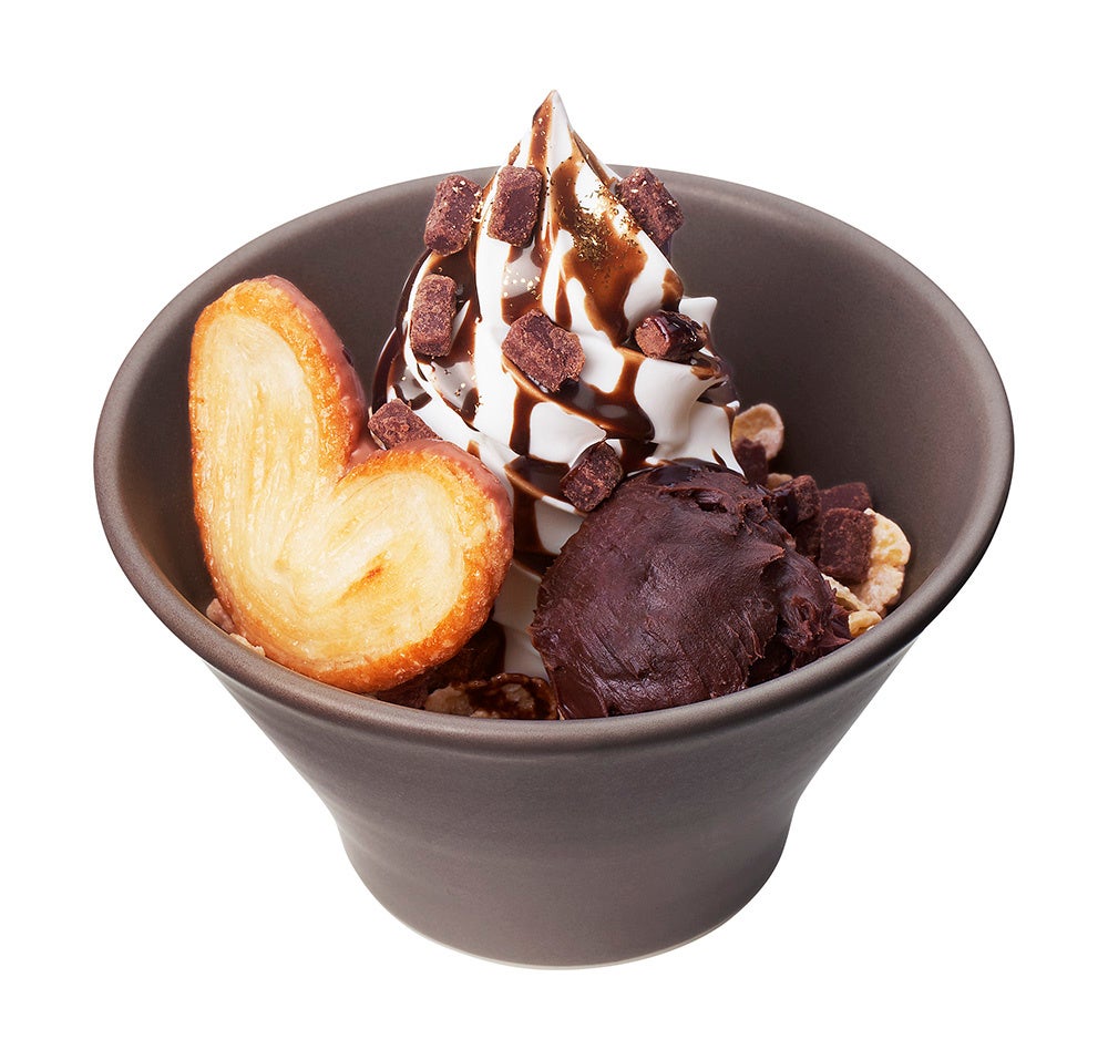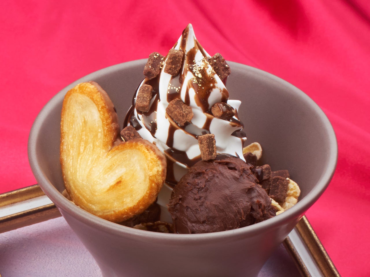 北海道産ミルクを使用した濃厚なソフトクリームに生チョコレートや生チョコレートソースをかけた、濃厚なチョコレート尽くしのパフェ。裏面にチョコレートがコーティングされた大きなハート型のサクサク食感のパイもバレンタインを演出するポイント。さらに、ソフトクリームに振りかけられるキラッと光り輝く金粉がさりげないゴージャス感を演出する、贅沢な一品です。