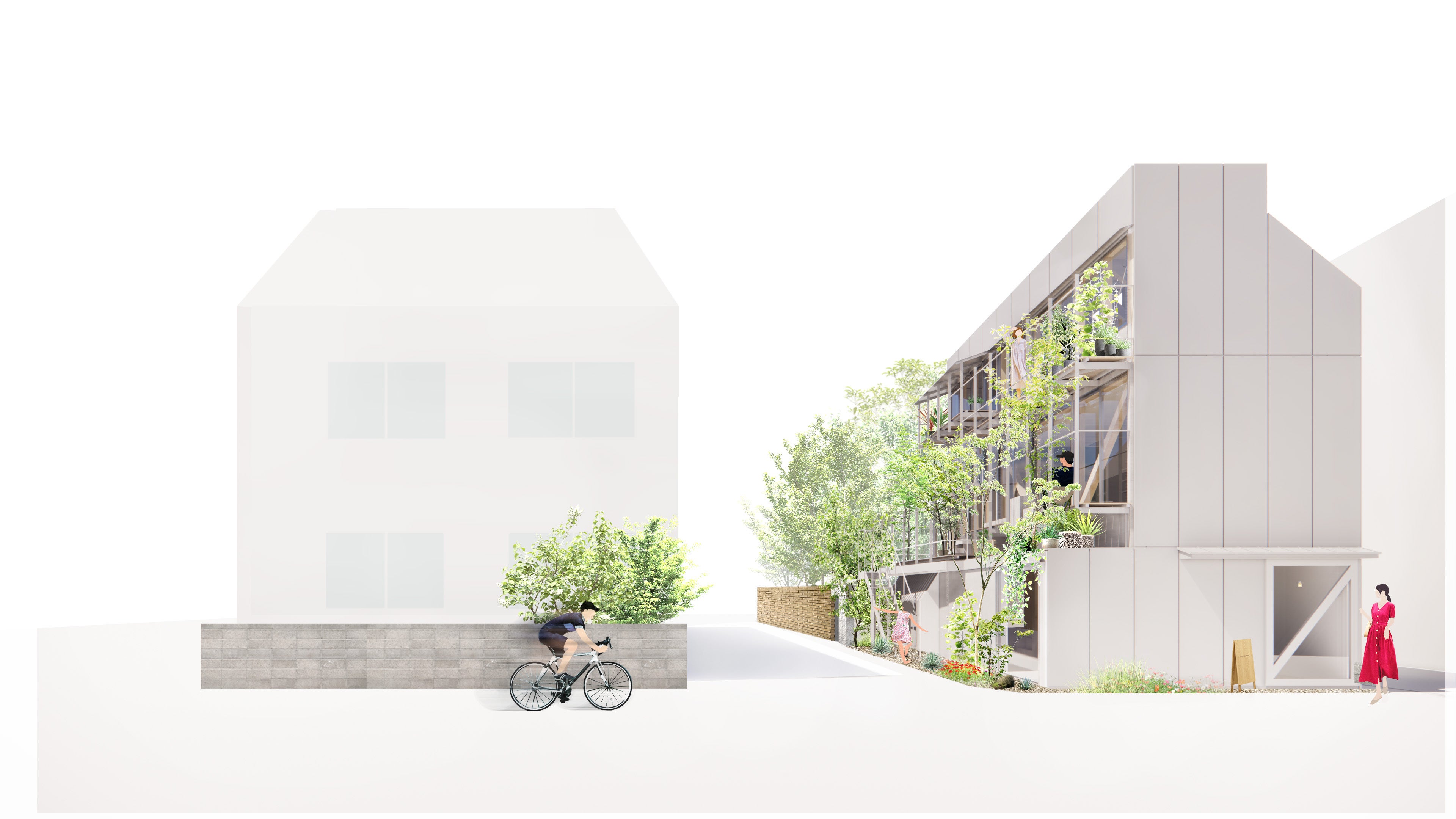 「三栄建築設計住宅設計競技2021 松原住宅計画」は「都心に住まう新たな価値創造の提案」というテーマで作品を募集しました。最優秀賞受賞作の「BALCONIES」は特にこのテーマに沿った設計となっております。通常、分譲住宅は「暮らす」という機能だけを持ち、間取りやデザインが決まった状態でお客様にご購入いただきますが、今回の「BALCONIES」では、通りに面した1階の一部に「ミセ」と呼ぶフリースペースを設けることで、街角にある小さなお店をもつ、街に開かれた新しい暮らし方を提案します。そして、住まわれるお客様が決まった後にそのお客様のライフスタイルにあわせて打合せをしながら一緒に「ミセ」を造り上げていきます。