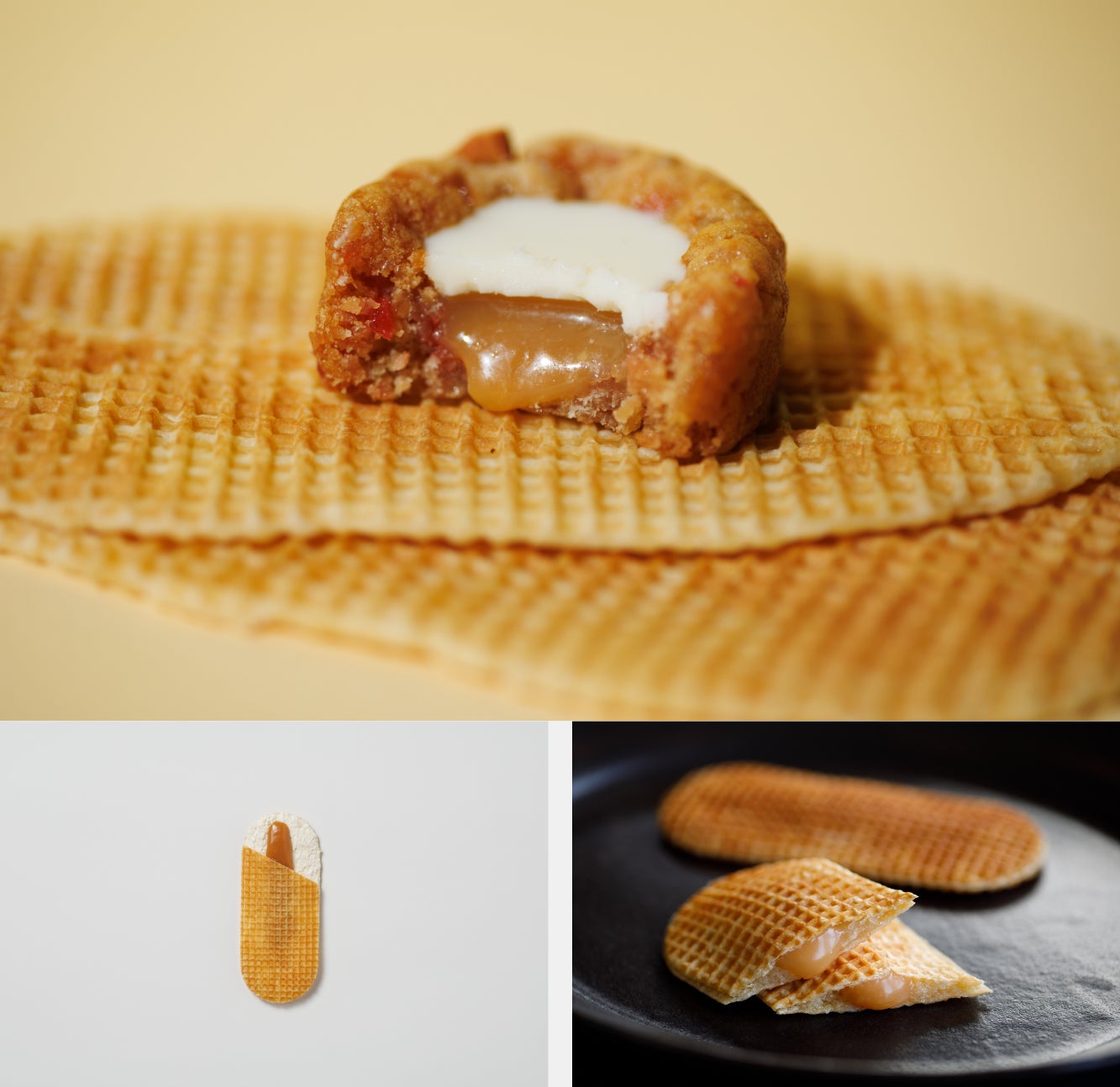 ーふわっ・シャリッ・とろっと食感:無脂肪乳から作ったミルク感たっぷりのジャムを、バターが香り立つゴーフレット(ワッフル)生地でサンド