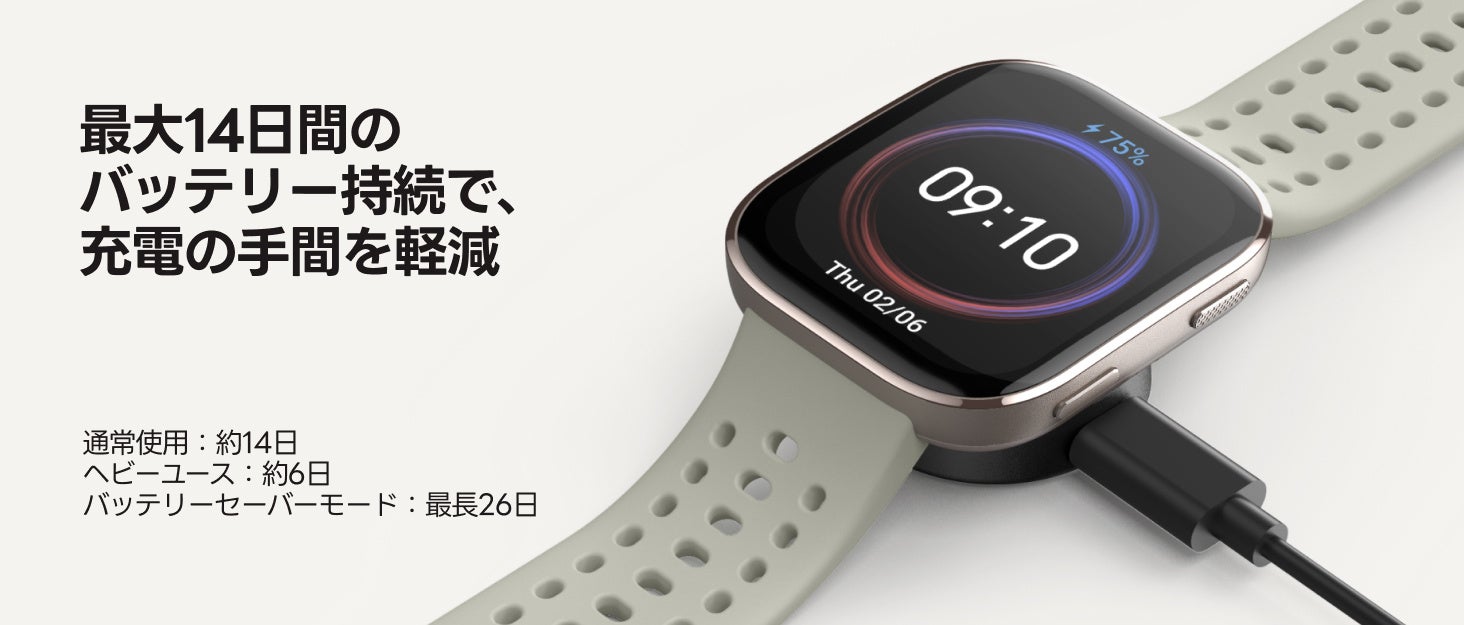 Amazfit Bip 6は、340mAhのバッテリーを搭載し、通常使用で最大14日間の連続使用が可能です。さらに、バッテリーセーバーモードを利用すれば、最大26日間の使用が可能となり、長期の旅行やアウトドア活動でも安心して使用できます。また、GPSを継続的に使用した場合でも最大32時間の稼働が可能であり、ランニングやハイキングなどの長時間のアクティビティにも対応します。