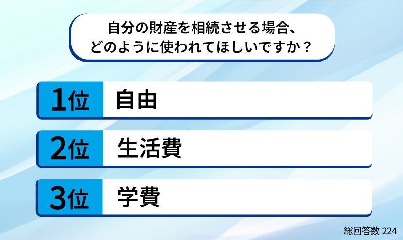 自分の財産を子供などに相続させる場合、どのように使われてほしいですか?と尋ねたところ、『自由(90票)』と回答した方が最も多く、『生活費(75票)』『学費(32票)』と続きました。