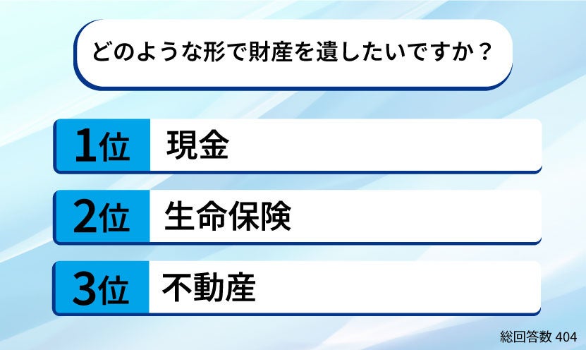 次に、「相続のご経験を踏まえ、どのような形で財産を遺したいですか?」と質問したところ、『現金(173票)』と回答した方が最も多く、『生命保険(92票)』『不動産(80票)』と続きました。