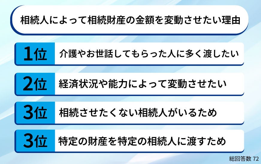 平等に相続しない理由で最も多かったのは、『介護やお世話をしてくれた人に多く渡したい』というもの。貢献度に応じて分けたいという気持ちがあるようです。