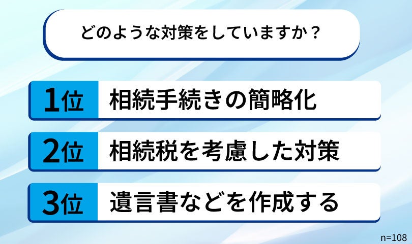 相続対策で一番多かったのは『手続きの簡略化』でした。財産を探すのが大変だった経験から、一覧を作ったり遺品整理をしたりする方が多いようです。