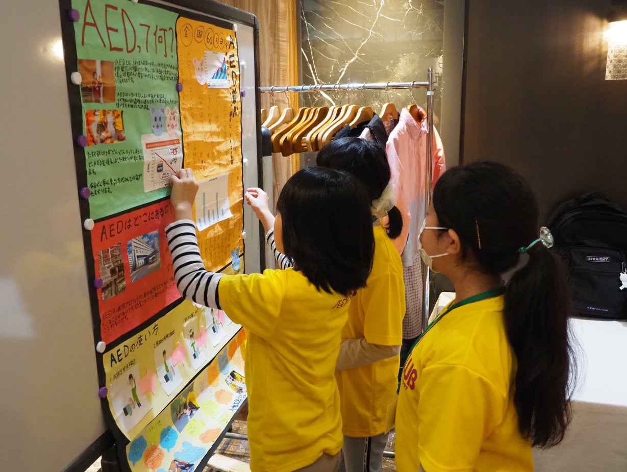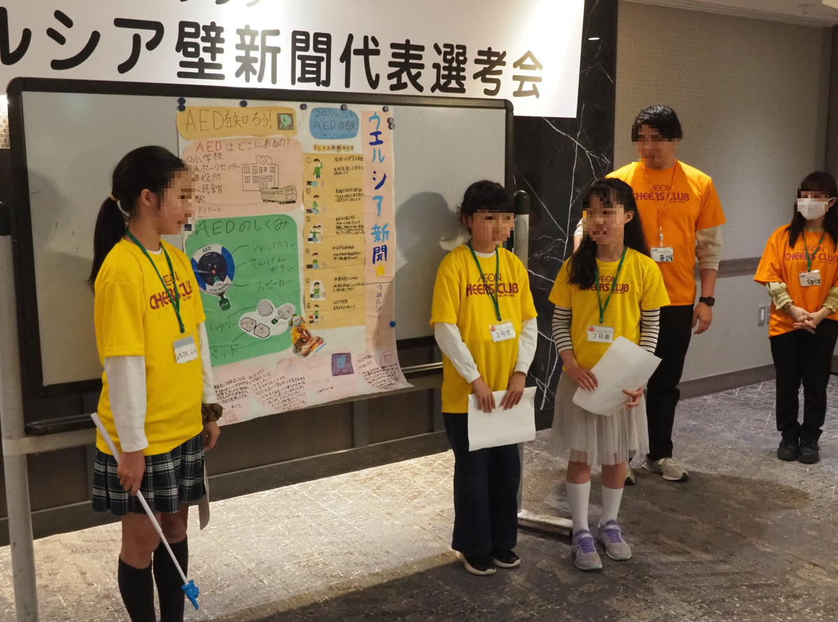 審査会の会場となった東京のホテル東京ガーデンパレスには、つくばとしずおかの両クラブから代表となった各3名の小学生のメンバーが集まりました。これまで「イオン チアーズクラブ」の活動を通じて体験したことをテーマに、一生懸命用意をした壁新聞を掲示し、審査員へ説明をしました。外部の有識者とウエルシアの役職員計6名が審査員となり、厳正な審査を行いました。