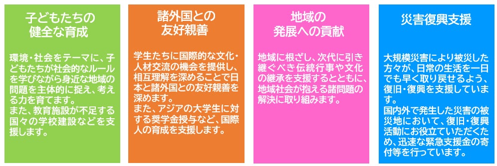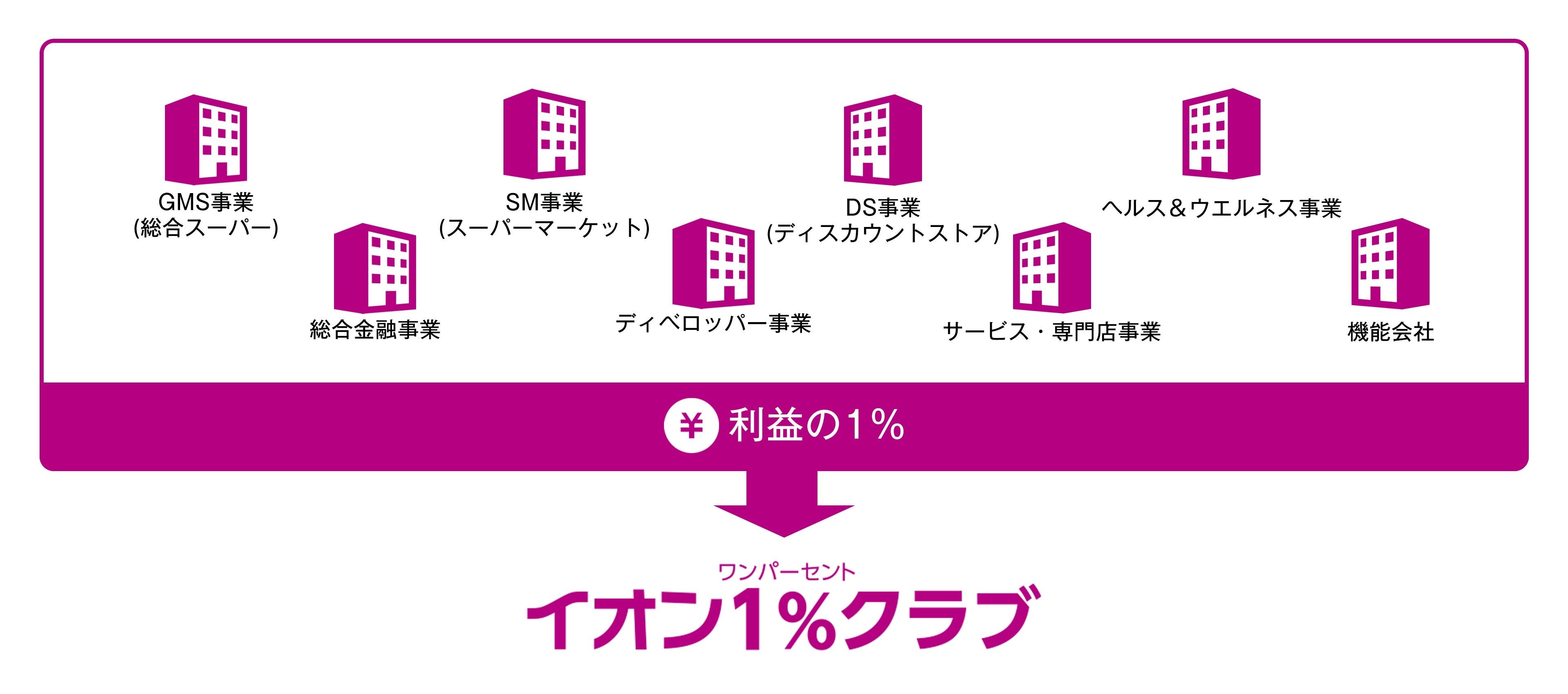 イオンワンパーセントクラブは、「お客さまを原点に平和を追求し、人間を尊重し、地域社会に貢献する」というイオングループの基本理念を具体的な行動に移し、社会的責任を果たすことを目的に、1990年に設立されました。以来30年以上にわたり、お客さまにイオングループをご利用いただいて生まれた利益の1%相当額をもとに、「子どもたちの健全な育成」「諸外国との友好親善」「地域の発展への貢献」「災害復興支援」を主な事業領域として、環境・社会貢献活動に取り組んでいます。
