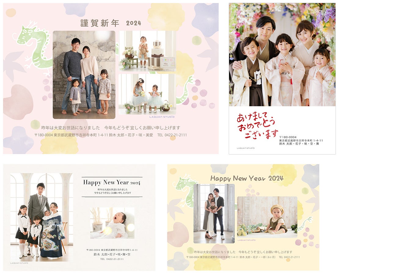 また、らかんスタジオでは、11月1日(水)よりオンラインで2024年分の年賀状のご注文受付をスタートします。早めのご予約なら、家族撮影キャンペーンで撮影したデータの中からお気に入りの写真を選び、オンラインでご注文いただけるので、家族写真を使った年賀状づくりがスムーズでお手軽。いつもお世話になっている方々に、素敵な家族の1シーンとともに新年のご挨拶をお届けいただけます。