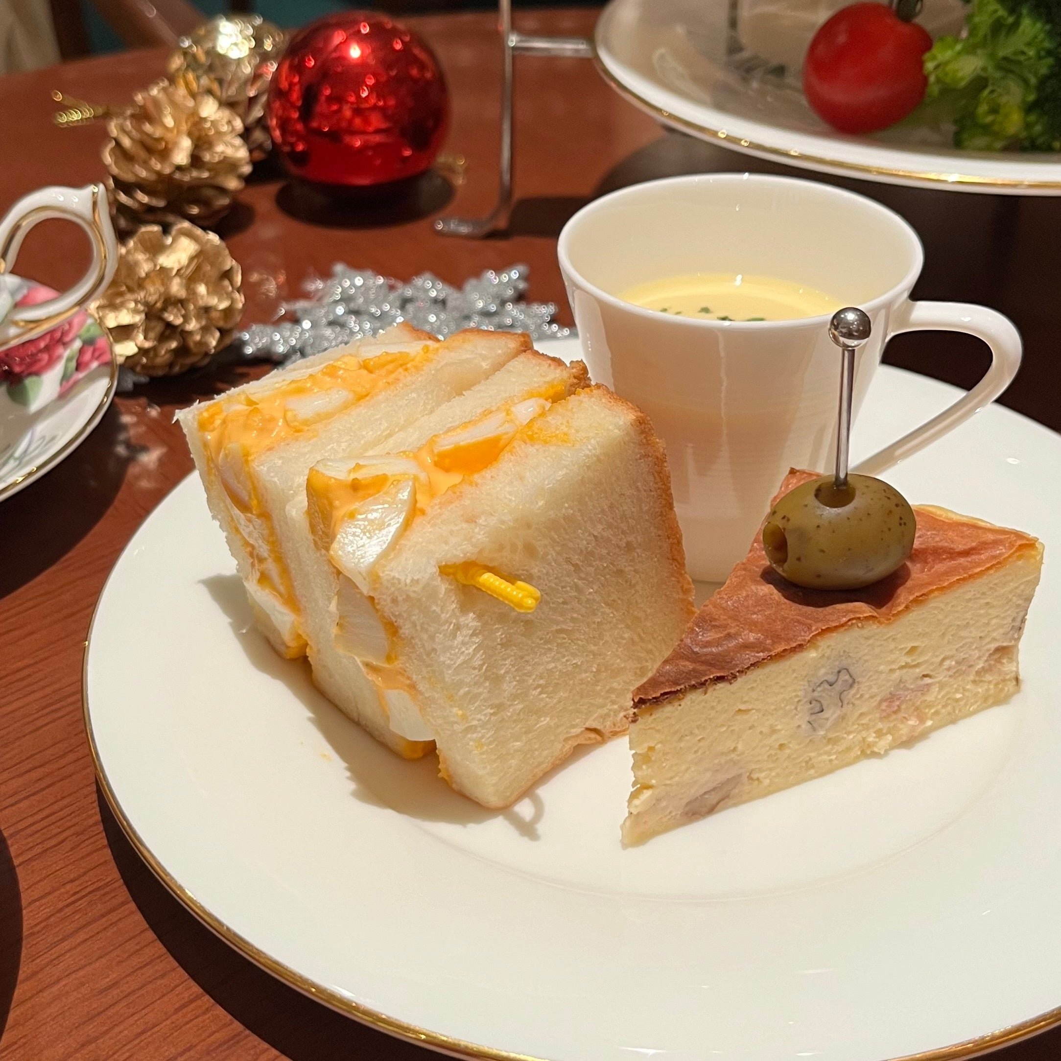 中段には、当店自慢の最高級生食パンに卵の黄身のクリーミーさと白身の食感を楽しめるタマゴサンドウィッチと、とうもろこしの優しい甘さがたまらないコーンポタージュ、軽い食感のクルミとベーコンの塩味、濃厚なカマンベールチーズを使用し、じっくりと焼き上げたチーズテリーヌになっております。