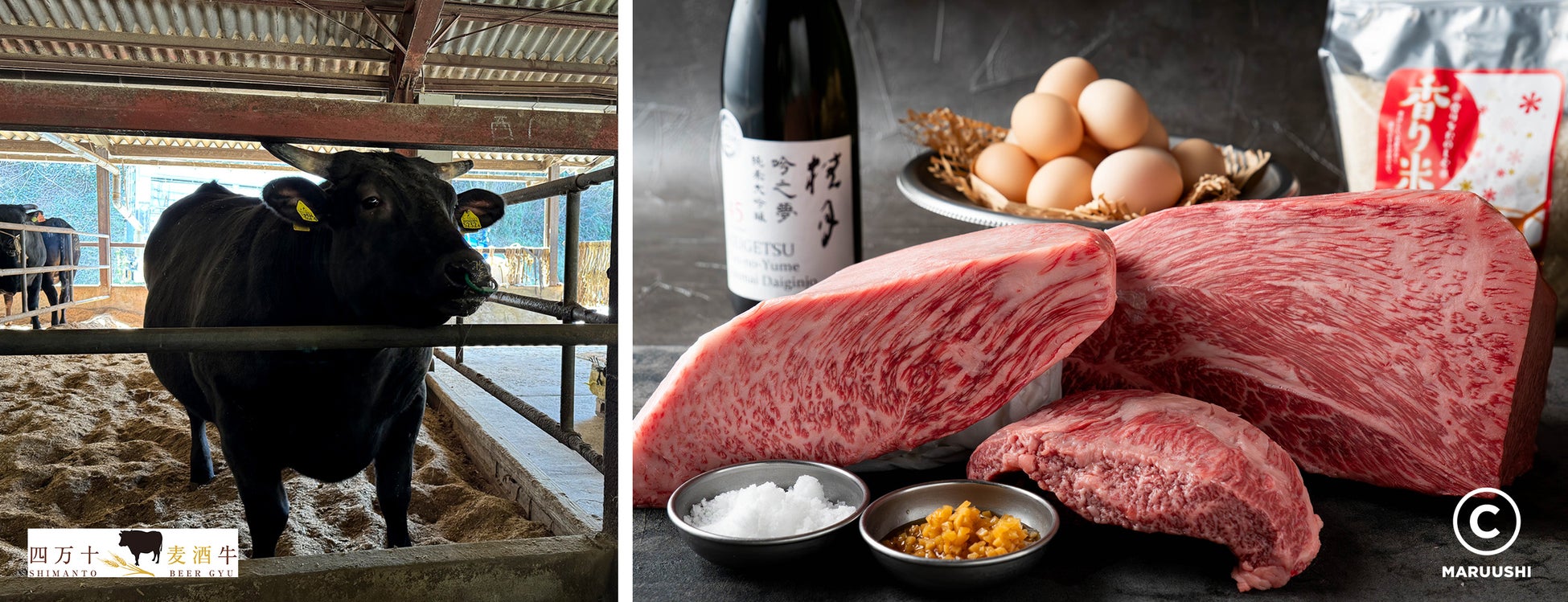 四万十町とのコラボのきっかけとなったのは四万十麦酒牛でした。高知県四万十町だけで飼育され、年間150~180頭ほどしか出荷されない四万十麦酒牛は、ほどよいサシが特徴で、赤身と旨味のバランスが抜群です。穀物にビール粕を加えた発酵飼料を与え、29~32ヶ月間かけて四万十川のほとりで長期肥育されています。