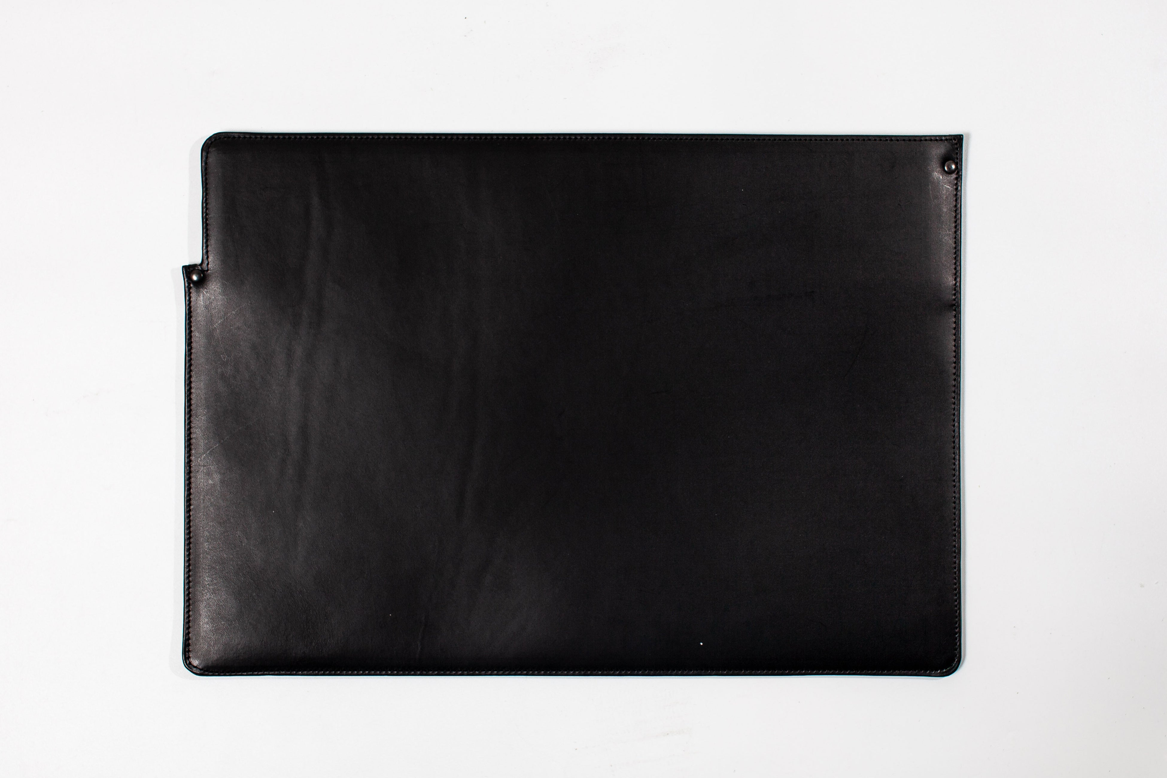 両面に1枚で抜いたブッテーロレザーを、なんとも贅沢に使用したシンプルなPCスリーブ。14inch macbookまでの収納を想定している。
