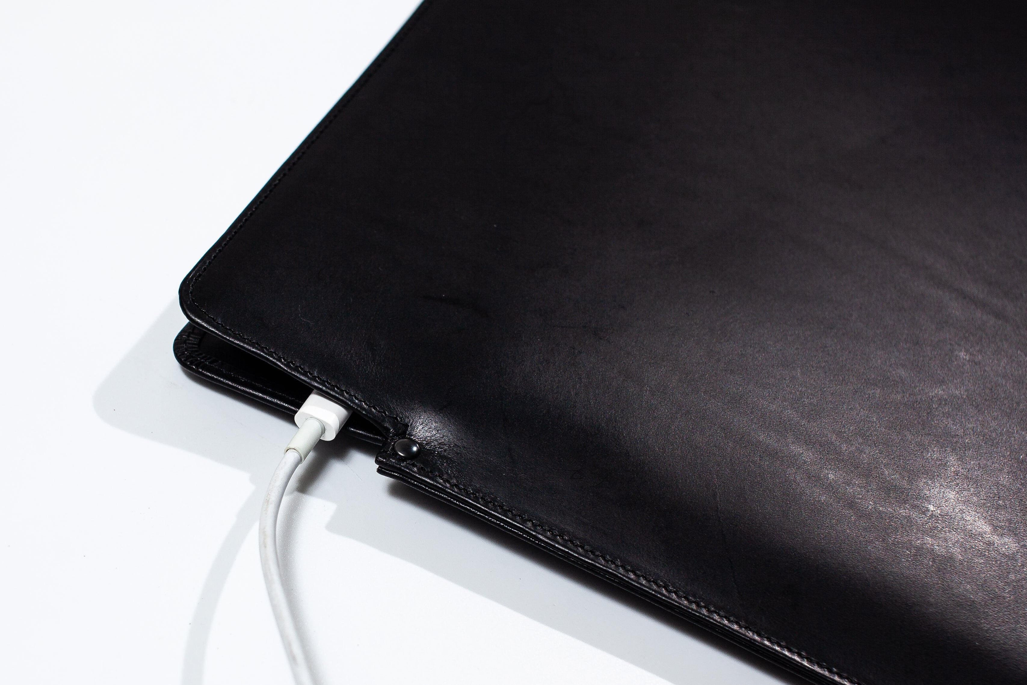 段差部分は上まで縫製せずスリットをいれることで、PCを収納したまま充電することが可能。