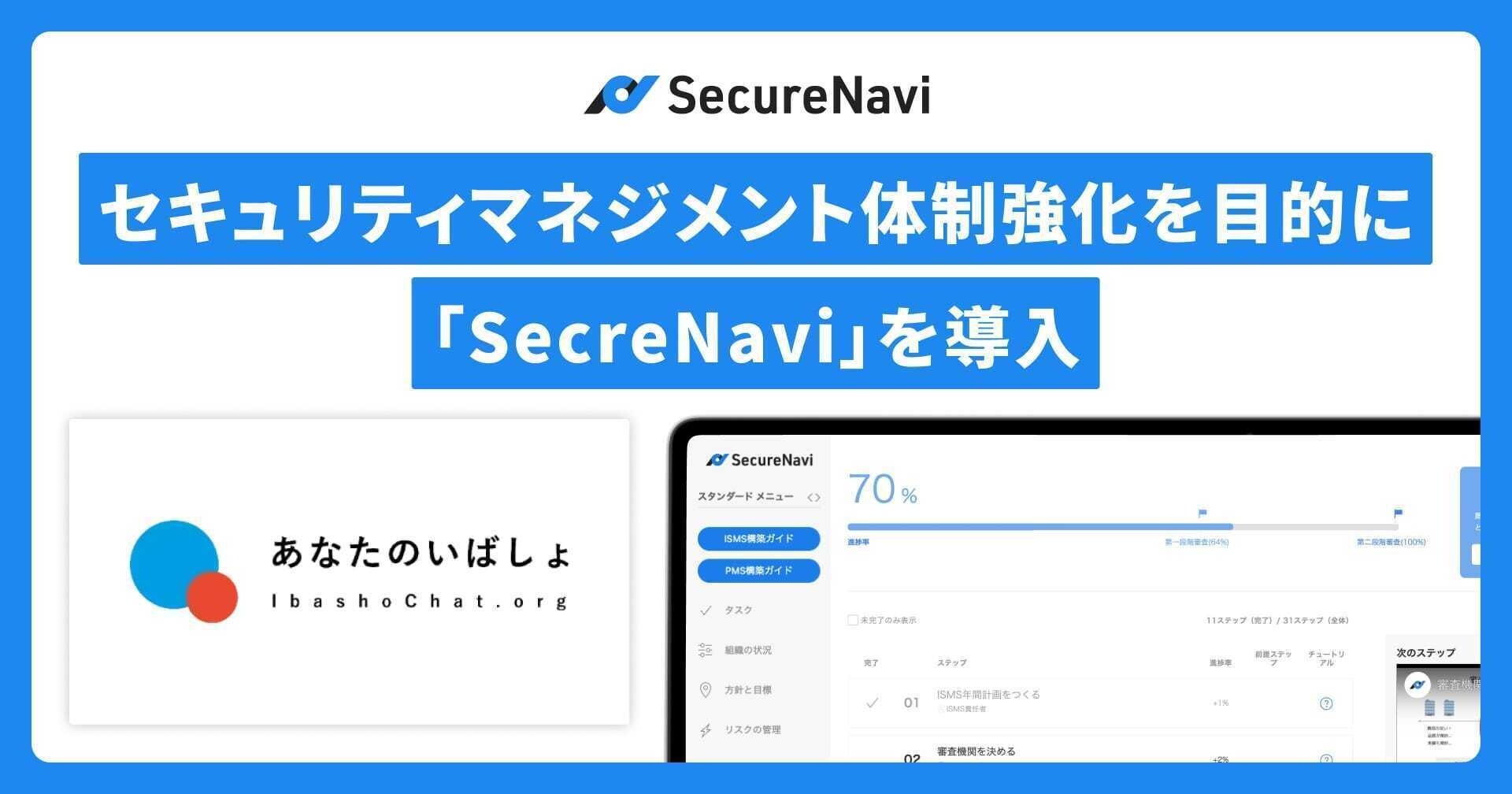 24時間365⽇、年齢や性別を問わず誰でも無料・匿名で利⽤できるチャット相談事業を運営する特定非営利活動法人あなたのいばしょ(東京都千代田区、理事長:根岸督和、以下「あなたのいばしょ」)は、セキュリティマネジメント体制強化を目的にISMS・Pマークオートメーションツール「SecureNavi」を導入したことをお知らせいたします。