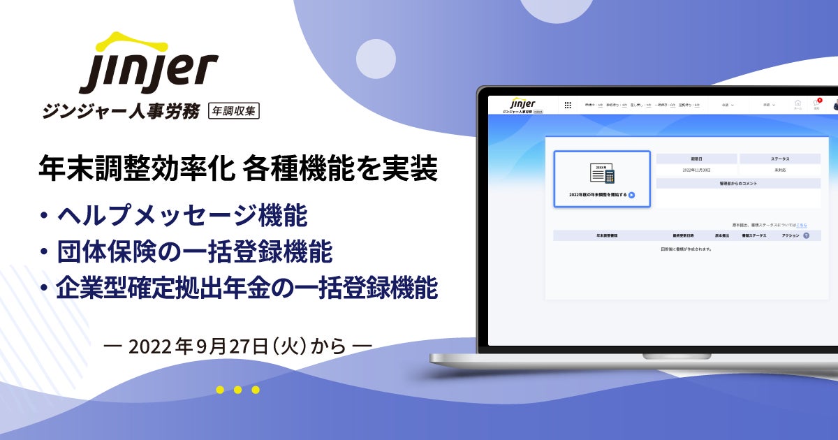 jinjer株式会社(本社:東京都新宿区、代表取締役CEO:加藤 賢、以下jinjer)が提供する、バックオフィス向けクラウドサービス「ジンジャー人事労務 年調収集」に、年末調整の業務効率化を実現する各種機能(ヘルプメッセージ機能・団体保険の一括登録機能・企業型確定拠出年金の一括登録機能機能)を2022年9月27日(火)から実装することをお知らせいたします。