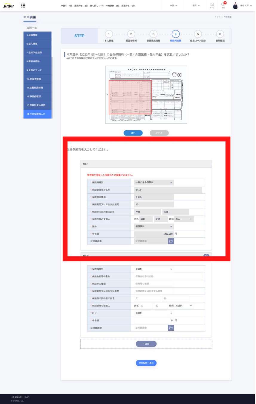 年調収集のアンケート回答依頼前に団体保険を管理者側で一括で登録できるようになりました。登録した保険料は、従業員の回答画面へ反映することが可能です。