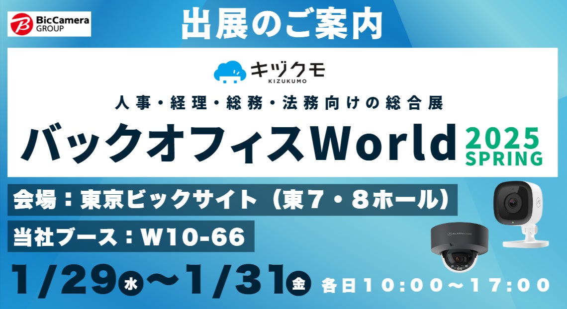 ビックカメラグループの株式会社ラネット(本社:東京都豊島区、以下「ラネット」)は、月額1,320円から始められるネットワークカメラサービス「キヅクモ」を提供しています。このたび、2025年1月29日(水)~1月31日(金)に東京ビッグサイトで開催される「バックオフィス World 2025 春 東京」に出展することをお知らせいたします。本展示会では、ネットワークカメラを活用した業務効率化、防犯対策、DX(デジタルトランスフォーメーション)の可能性を具体的にご紹介します。