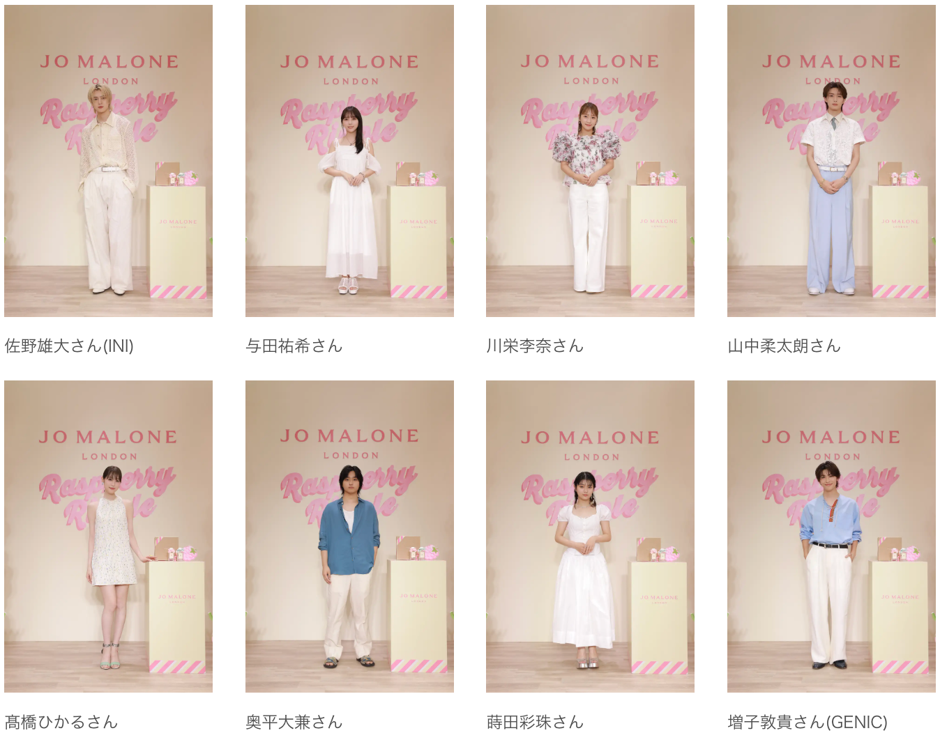 開催に先立ち実施したフォトコールには、夏らしい装いと限定コレクションの「ラズベリー リップル」の香りを纏った豪華なゲストが登壇しました。11人組グローバルボーイズグループINIの佐野雄大さん、俳優の川栄李奈さん、乃木坂46の元メンバーで現在はタレントや女優として活躍されている与田祐希さん、俳優・アーティストの山中柔太朗さん、俳優の髙橋ひかるさん、俳優の奥平大兼さん、女優の蒔田彩珠さん、男女7人組ダンス&ボーカルグループGENICのメンバーで、俳優の増子敦貴さんが、3日間限定のポップアップの見どころや、限定フレグランスの魅力や香りから連想する”夏の思い出”を語ってくれました。