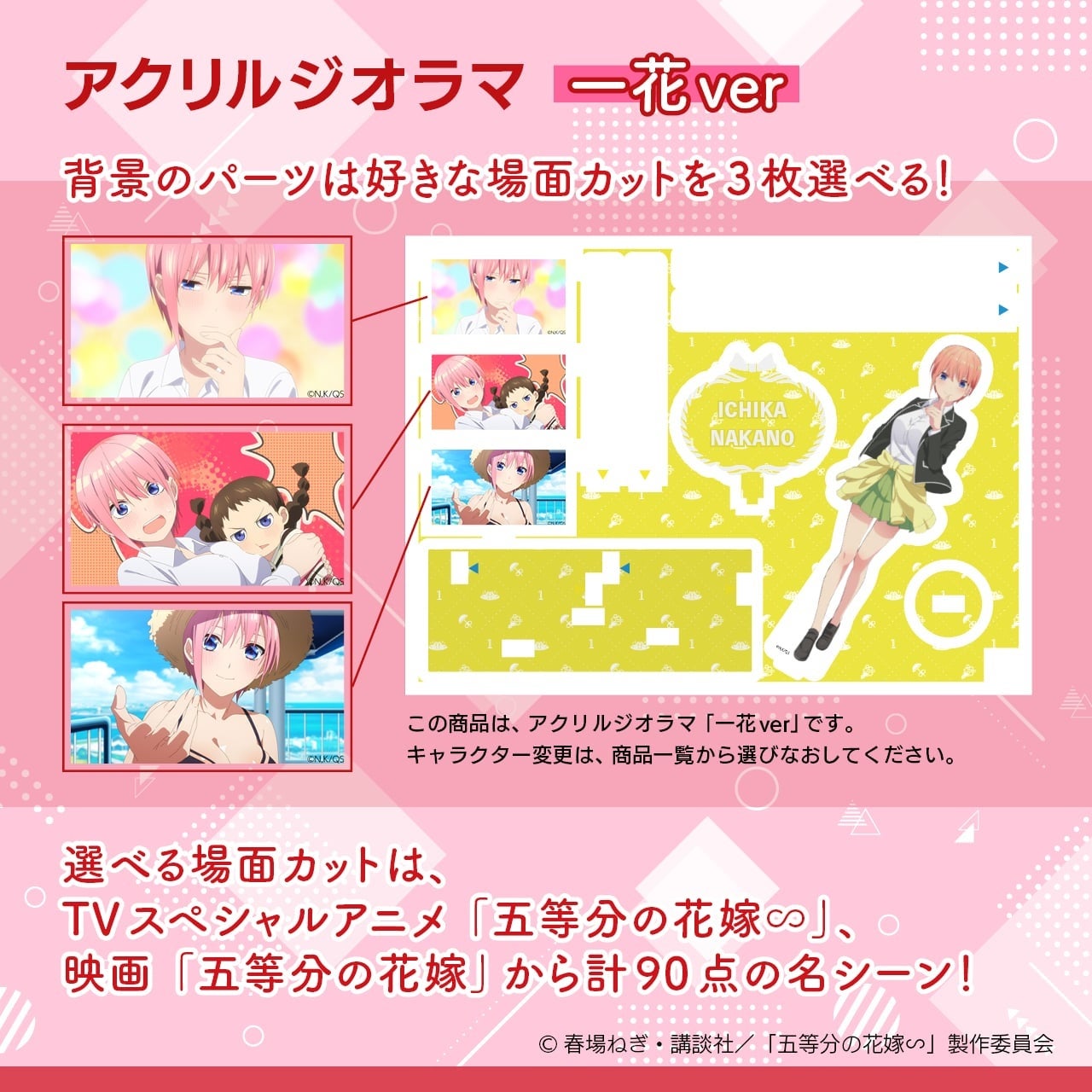 TVスペシャルアニメ「五等分の花嫁∽」の名場面から好きなシーンを選び、自分好みのカスタマイズグッズが作れます。