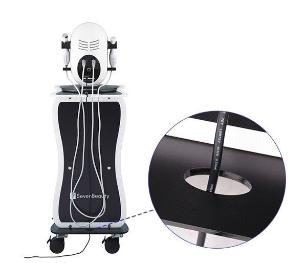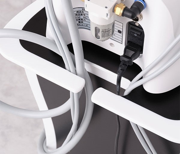 上段の前面は使いやすい取っ手があり、移動の際に便利です。また施術中にはタオルをかけて使用することもできます。背面のスペースには、機器のコードやケーブルなどをまとめて収めることができます。