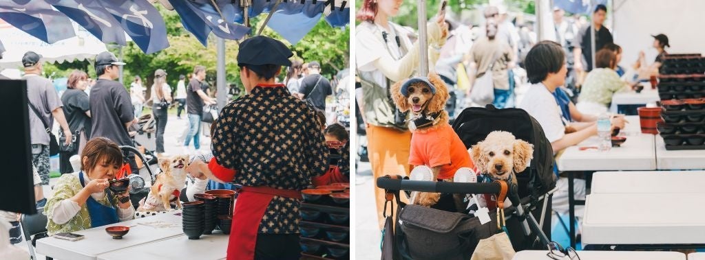 目玉企画のひとつ「わんこそば体験」では、岩手県の老舗「初駒」の協力のもと、屋外で楽しめる特別なわんこそばが振る舞われ、参加者は次々とお椀を重ねながらその魅力を満喫。わんちゃんと一緒に楽しんでいるお客様の姿も印象的でした。