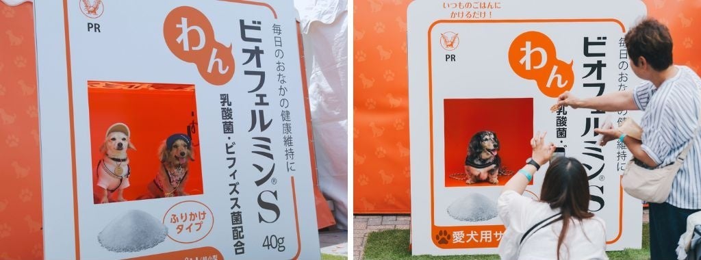 今回のイベントで大きな注目を集めた「わんビオフェルミS」フォトスポットでは、大正製薬株式会社の「わんビオフェルミンS」愛犬専用パッケージになりきれるユニークなフォトブースに、多くの来場者が足を運びました。パッケージ風のデザインに収まった愛犬の姿は思わず笑みがこぼれるほど可愛らしく、飼い主の皆様もシャッターを切る手が止まらない様子でした。