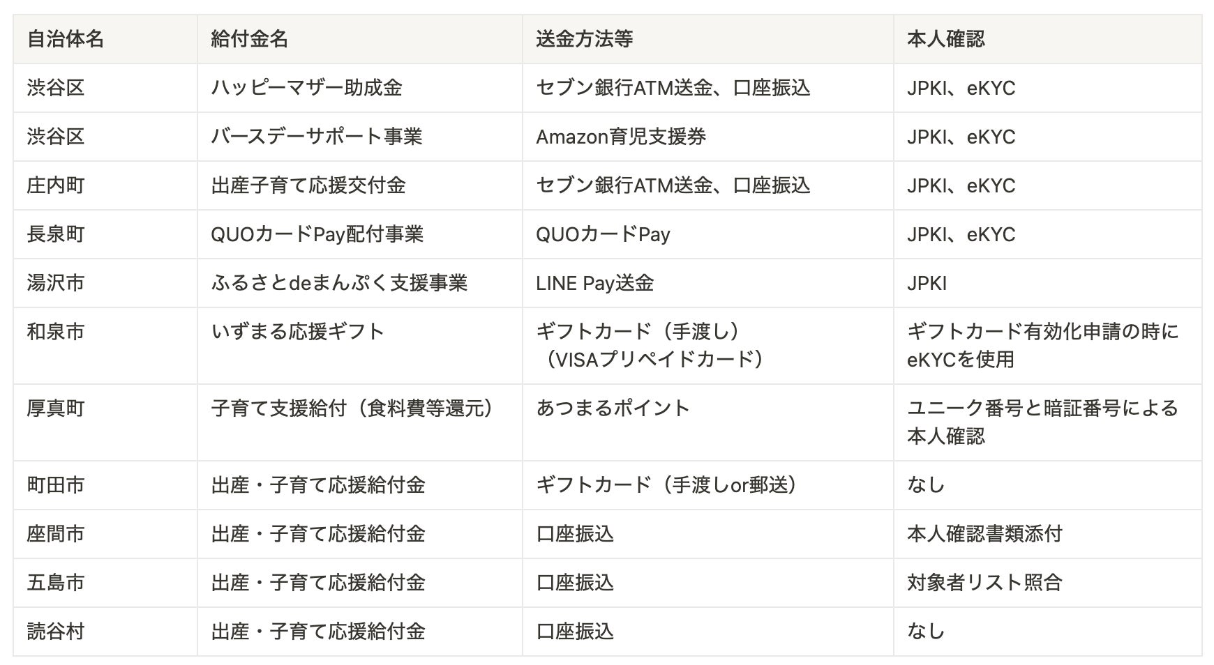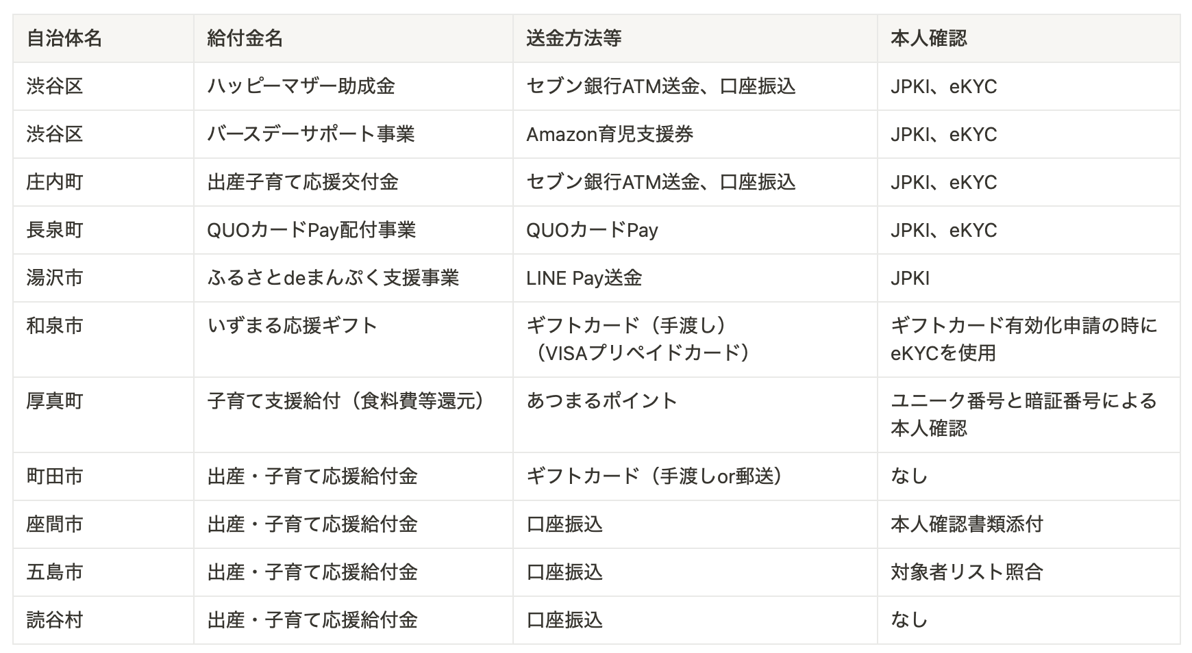 他、2024年1月現在、給付金手続きを実装している自治体は、渋谷区、庄内町、長泉町、湯沢市、和泉市、厚真町、町田市、座間市、五島市、読谷村です。給付金の種類や送金方法、手続きに利用している本人確認はさまざまです。特に本人確認については、JPKI認証(マイナンバーカードを使った本人確認)を行うことによって、基本4情報(氏名、生年月日、性別、住所)の入力を省くことも可能です。