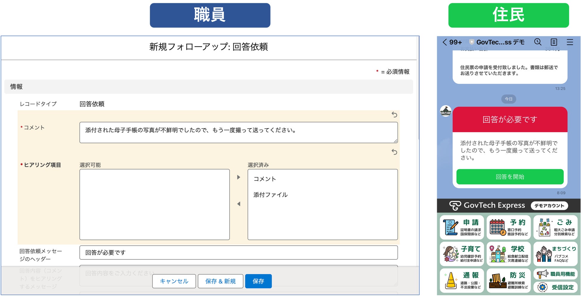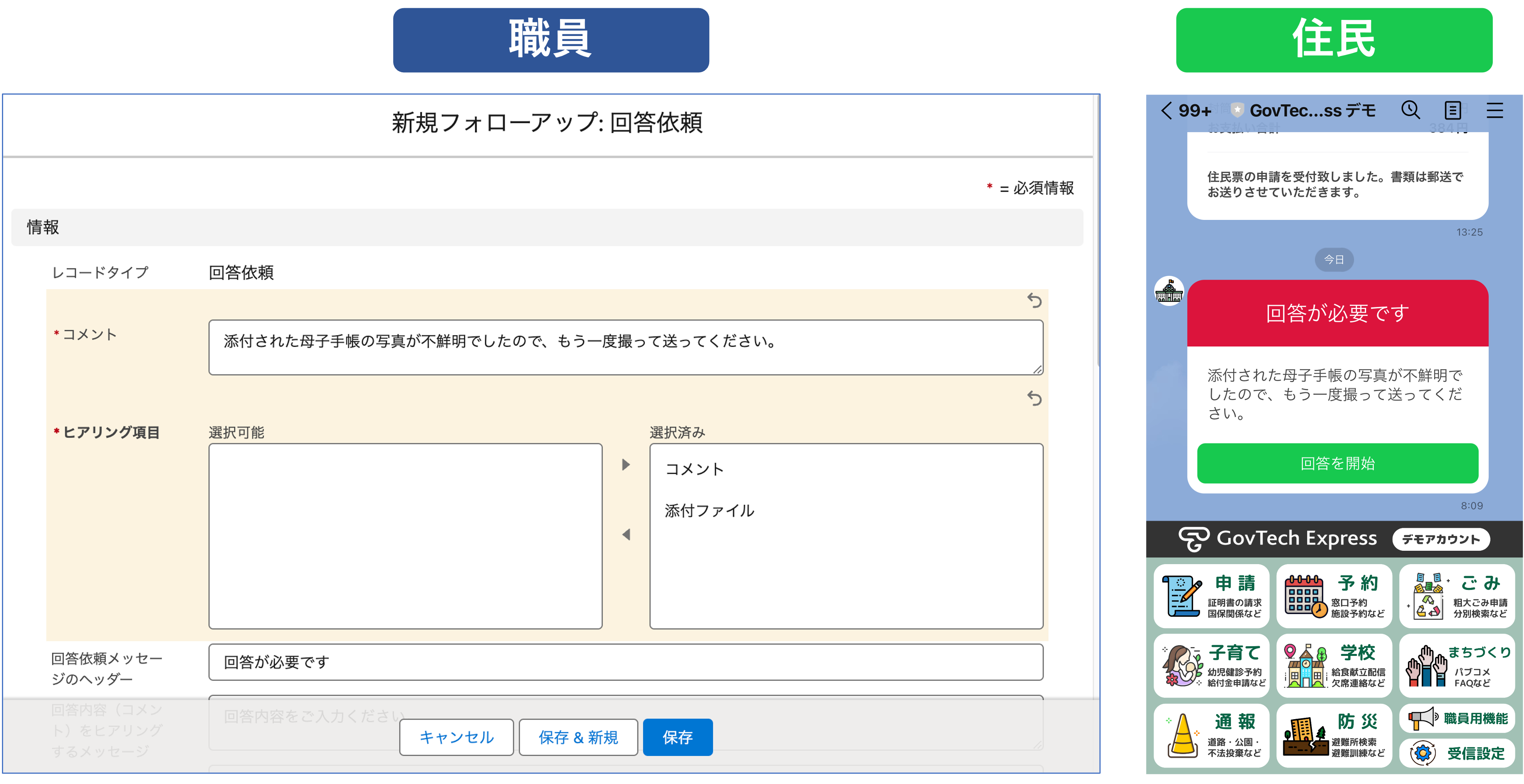 ※参考画像:職員の操作画面と住民に届いたメッセージ