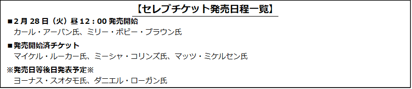 また、先日来日が発表となったヨーナス・スオタモ氏、ダニエル・ローガン氏のセレブチケットに関しては、後日発表させて頂きますので、今しばらくお待ちくださいませ。