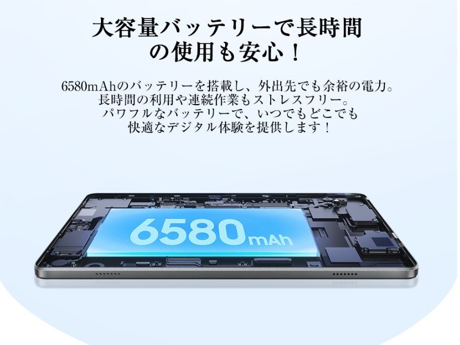 バッテリー容量は6,580mAhと大きめであり、長時間の連続使用が可能。外出先でも安心して長時間利用でき、利便性に優れています。