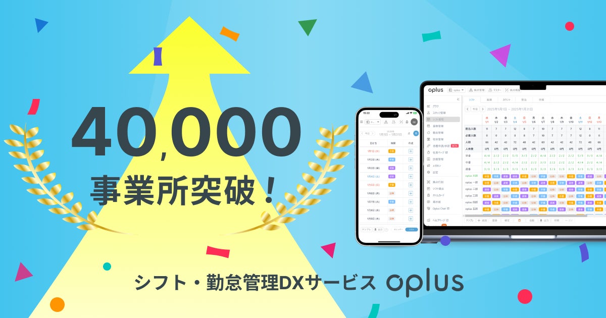 Oplus株式会社(本社:東京都渋谷区、代表取締役:杉原 和樹)が提供するブラウザ・スマホアプリの全てに対応したシフト・勤怠管理DXサービス「oplus(オプラス)」の累計導入数が40,000事業所を突破したことをお知らせします。