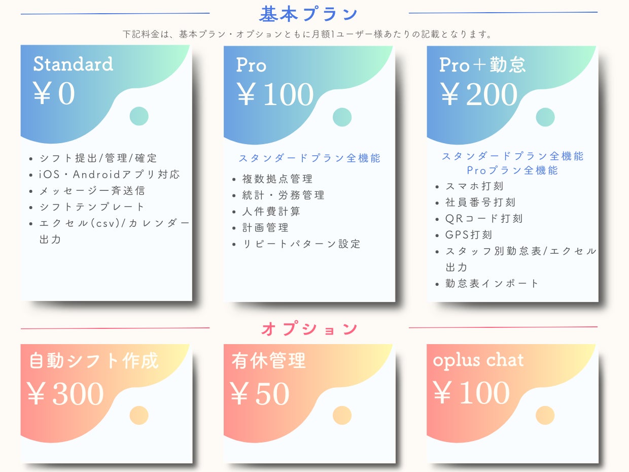 有料プランでは人件費計算などの機能が追加されるほか、スマホアプリやPCなど豊富な打刻に対応した「勤怠管理」、出勤インターバルや連勤アラートなどにも対応した高度な「自動シフト作成機能」、付与日数の設定や申請・承認に対応した「有給休暇管理」、社内コミュニケーションに対応したビジネスチャット機能「oplus chat」など、必要に応じて様々なプラン、オプションを低価格なoplus priceで提供しています。