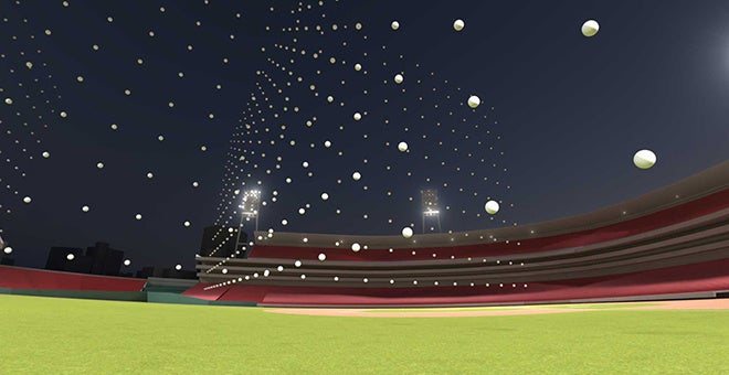 プレーヤーが存分にパフォーマンスを発揮できるよう、グレアを抑えつつボールの視認性を最適化するため、照明手法としてクロスエイミングを採用し、シミュレーションや現地での検証を重ねた革新的照明システムです。照明改修前のHID投光器から高効率のLED投光器へ更新したことにより、照明器具台数は約44%減(648台⇒360台)、消費電力は、約55%削減し(約1036kW⇒約463kW)環境負荷を大幅に削減しています。