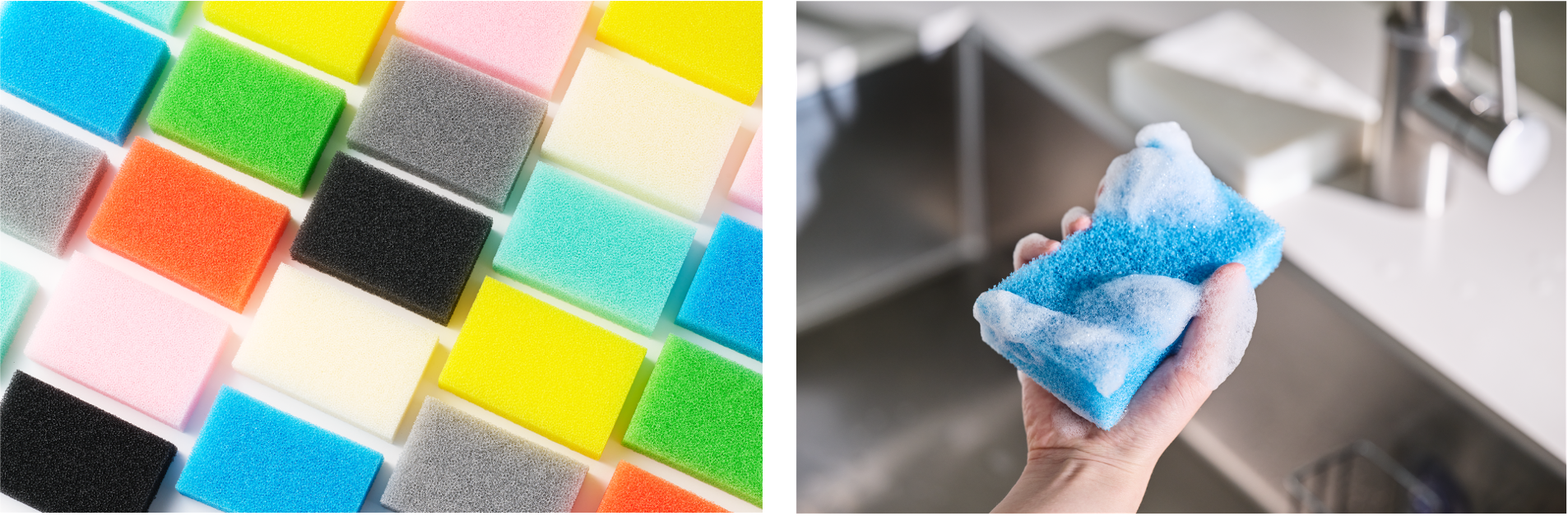 ダイニチ・コーポレーションは創業から、食器洗い用固形洗剤の製造販売を行っています。製造から販売を行う中で、固形洗剤と相性の良いスポンジを研究し、高品質ポリウレタンを使用した、従来のスポンジの概念を覆す「サンサンスポンジ」が生まれました。半年以上使えるほど丈夫で長持ちなので、ごみの削減に。