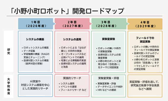 本プロジェクトでは、ロボットの身体設計(ハードウェア)、動作設計、画像認識、音声AI(音声生成AI)、自律対話システムなどを段階的に開発・搭載します。ロボットに毛筆をもたせて和歌をしたためたり、音声AIによって人と対話したりすることで、小野小町の感性や物語を現代に表現します。